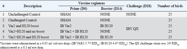 ABSTRACTBackground: Infectious bronchitis (IB), caused by the IB virus (IBV), is a highly contagious respiratory disease of poultry that causes widespread global economic losses within the poultry industry. The high mutation rate of IBV and continual emergence of new serotypes present a major challenge for disease control which is mainly focused on vaccination. Aim: The objective of the current study was to evaluate the efficacy of two commercially available vaccines, MEVACTM IB H120 and MEVACTM IB VAR 2, against challenge with a heterologous virus, IBV QX in specific pathogen-free chickens. Methods: Serological responses to IBV QX challenge were evaluated using Enzyme-Linked Immunosorbent Assay (ELISA) and hemagglutination inhibition (HI). Results: By day 35, all vaccinated groups showed a significant increase in mean antibody titers to IBV QX. At days 14 and 28, all vaccinated birds demonstrated the presence of HI antibodies against IBV QX. A reduction in viral shedding was observed in all vaccinated groups. All vaccinated groups exhibited a clear reduction in ciliostasis scores, indicating that the vaccines provided protection against IBV QX challenge. Histopathological analysis further confirmed the beneficial effects of vaccination in reducing tracheal damage, with all vaccinated birds exhibiting lower scores than the control group. The study demonstrates that a combination of variant (MEVACTM IB VAR 2) and classical (MEVACTM IB H120) vaccine strains provided cross-protection against IBV QX heterologous challenge. Conclusion: In so doing, the study contributes important insights to help guide the development of future vaccination programs in combating the threat that IBV poses to the poultry industry. Keywords: Infectious bronchitis, Infectious bronchitis virus, IBV QX Challenge, Vaccine efficacy, Poultry respiratory pathogen. IntroductionInfectious bronchitis (IB) is a highly contagious respiratory disease of poultry caused by the IB virus (IBV), a gammacoronavirus belonging to the Coronaviridae family. First reported in 1931 (Schalk and Hawn, 1931; Cavanagh and Naqi, 2003; Jackwood, 2012; Swayne and Boulianne, 2020), the disease affects the respiratory, urinary, and reproductive systems of infected birds. IBV typically induces respiratory signs, poor feed conversion ratio, and reduced weight gain in broilers, while in layers, it leads to significant drops in egg production and quality in layers, resulting in widespread global economic losses within the poultry industry (Ignjatović and Sapats, 2000; Cavanagh and Britton, 2008). IBV is an enveloped, single-stranded RNA virus that encodes three virus-specific proteins: the spike, membrane, and nucleocapsid glycoproteins (Rottier et al., 1984; Maier et al., 2015). Among these, the spike protein holds particular importance for both the virus’s infectivity and vaccine efficacy. The spike protein consists of two glycopolypeptides, S1 and S2, which extend from the virus surface, facilitating attachment to host cell surfaces and entry into host cells (Cavanagh et al., 1997; Sultan et al., 2019). The S1 glycoprotein plays a crucial role in determining serotype and binding of the virus to the host cell receptor. It contains a number of epitopes (or antigenic determinants) to which antibodies attach, and most hemagglutination inhibition (HI) and serum neutralization antibodies are directed against this glycoprotein (Butcher et al., 2009; Legnardi et al., 2020). Based on the spike protein full sequence, there is a new nomenclature for IBV split viruses belonging to IBV genotype-I into 29 subtypes from GI-1 to GI-29 (Valastro et al., 2016). Clinical signs of IB depend on the tissue tropism of the infecting virus. Nephropathogenic strains, with a renal tropism, often exhibit the highest mortality rates, with IBV replicating in renal tubular epithelial cells, leading to structural changes in the kidneys. Unvaccinated flocks may experience morbidity close to 100 percent (Jordan, 2017; Sultan et al., 2019), with the disease being more severe in young birds. Efforts to control IB primarily revolve around vaccination. However, despite the widespread use of vaccines dating back to the 1950s, the disease continues to circulate widely, severely impacting the poultry industry and complicated with several secondary infections (Diab et al., 2019). This lack of progress in disease control is largely due to the inherent high mutation rate of IBV, which results in continuous genetic and antigenic changes of the circulating virus, leading to the emergence of new strains or serotypes (Cook et al., 2012). Most of these genetic mutations occur in the S1 glycoprotein, where even minor changes in the amino acid sequence can give rise to new serotypes (Jackwood and de Wit, 2013). This constant change makes the successful control of IBV by vaccination challenging (Hoerr, 2021). As a consequence, no single vaccine can protect against all emerging serotypes (Sultan et al., 2019). However, research has shown that a heterologous vaccine virus may provide cross-protection (Elhady et al., 2018). In other words, the vaccine confers protective immunity against an IB serotype that shares cross-reacting antigens with the vaccine virus (Sultan et al., 2019). This cross-protection is possible, because despite the frequent mutations in the S1 protein, much of the viral genome, including some S1 epitopes, remains unchanged. Additionally, the S2 protein, being genetically more stable than S1, also has epitopes that may contribute to the production of protective antibodies. Given the dynamic nature of IBV in the field, an alternative to the use of homologous vaccines is necessary for successful disease control and to minimize the complications with other pathogens in poultry flocks (Mahmoud et al., 2022; Zanaty et al., 2023). Protectotyping, a concept suggested previously (Lohr, 1989), involves combining vaccine virus strains that are antigenically different into a vaccination pr
