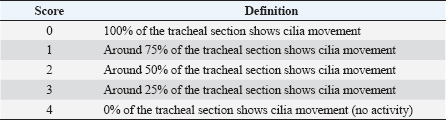 Challenge virus strainAll birds, except the unchallenged control group, were challenged on D28 with the IBV QX strain, GI-19 genotype (Poulpharm BV, Izegem, Germany, 2019 isolate; Table 1). Each bird received a dose of 0.1 ml containing 104 EID50 of the challenge virus via eye-drop administration. Sampling and measurementsClinical signsGeneral health observations were conducted and recorded by an experienced animal caretaker at least once daily, starting from hatching and continuing until the conclusion of the study. Specific clinical observations for signs associated with IBV were recorded daily D28–D35. The scoring system for clinical signs was previously described (Sultan et al., 2019; Kilany et al., 2025). Serological responses against IBVOn D0, four blood samples of at least 1 ml were collected from ten, unenrolled hatchmates. These samples were subjected to serological analysis using the Enzyme-Linked Immunosorbent Assay (ELISA) method (Biocheck BV, The Netherlands, Cat. CK119IBV) to confirm that the flock of SPF chickens was free from antibodies against IBV. At days 14, 28, and 35, blood samples were collected via wing vein from ten animals per group to determine the serological responses to the IBV QX challenge. Serum was separated by centrifugation and analyzed by both ELISA and HI assay. IBV antibody titers measured by ELISA below 833 were considered negative. IBV QX antigen (Poulpharm, Izegem, Germany) was used in the HI assay to assess the presence of inhibitory antibodies against IBV. All HI titers were expressed as the log2 of the reciprocal of the highest serum dilution showing complete HI. Viral shedding after challengeOn D31, D33, and D35, tracheal swabs were taken from ten birds per group (the same ten birds that were used for blood sampling throughout the study) and stored in phosphate-buffered saline. Samples were processed for quantitative real-time polymerase chain reaction (RT-qPCR) with a commercial kit specific for the IBV QX (IBV QX, Cat. 31095, Kylt, Höltinghausen, Germany) according to the manufacturer’s instructions. Simultaneously, 10-fold dilutions of the vaccine were analyzed with the same kit, and the Ct values from the qPCR analysis were correlated with the known titer (EID50) of the diluted vaccine samples. The qPCR data were represented as an IBV QX titer (Log10EID50/ml) based on this correlation with live infectious virus. Ciliostasis scoringOn day 33 and day 35, seven birds from each group were humanely euthanized by intravenous injection of an overdose of a 300 mg/ml solution of pentobarbital sodium (Release®). Separate birds were used for ciliostasis scoring from those used for tracheal swabbing. The tracheas were collected and placed in individual 15 ml sterile conical tubes containing 10 ml pre-warmed minimum essential medium (MEM) Hanks’ salt. Tracheal samples were transferred to sterile Petri dishes containing 5 ml of MEM Hanks’ salt, and any excessive fat and connective tissue were removed using a scalpel. Each trachea explant was flushed twice with MEM Hanks’ salt. Ten thin transverse tracheal sections were cut using a scalpel, with three sections obtained from the upper, four from the middle, and three from the lower part of the trachea. These sections were observed under a light microscope at 10× and 100× magnification within 2 hours of sampling to assess ciliary activity. The activity of the cilia in each tracheal section was scored for ciliary movement (Table 2). The scoring criteria for determining normal ciliary activity were based on the European Pharmacopoeia monograph 07/2021:0442, Avian IB vaccine (live). Specifically, ciliary activity in a given tracheal section was considered normal if at least 50% of the internal ring exhibited vigorous ciliary activity, in other words when the ring received a score of two or less. To be deemed normal, a bird needed to have a minimum of nine out of ten rings showing normal ciliary activity. To calculate the ciliostasis score for each bird, the scores for all 10 tracheal sections were summed, and the mean score per tracheal ring was evaluated for each treatment group. Table 2. Ciliostasis scoring for tracheal sections.