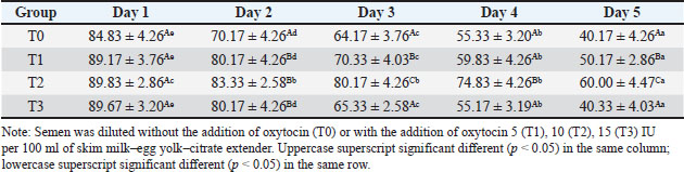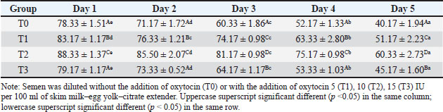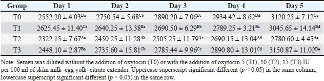 Table 3. Motility (%) of Sapudi ram spermatozoa in skim milk–egg yolk–citrate extender without or with the addition of several doses of oxytocin at 5°C for 5 days.