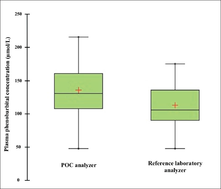Fig. 1. Box plot comparing plasma phenobarbital concentrations measured by the point-of-care (POC) and reference laboratory analyzers. The red crosses indicate the mean phenobarbital concentration for each method. Table 1. Results of Passing–Bablok regression, Lin concordance correlation coefficient (CCC), and Bland–Altman plot bias analysis to assess the agreement between the POC and reference laboratory analyzers for quantifying canine and feline plasma phenobarbital concentrations.