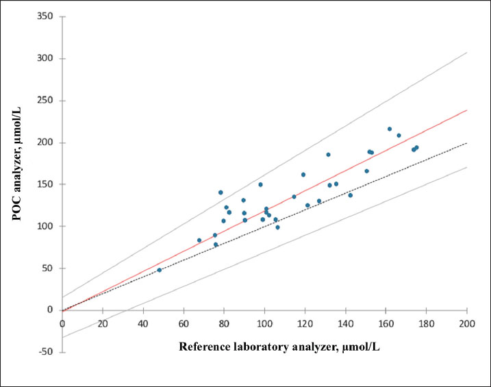 Fig. 2. Passing–Bablok regression analysis comparing plasma phenobarbital concentrations obtained using the point-of-care (POC) and reference laboratory analyzers. The solid red line represents the regression line, and the dashed black line represents the line of identity. Grey lines indicate the 95% confidence intervals for the slope and intercept. Table 2. Assessment of normality and descriptive statistics (mean ± 2 SD) for plasma phenobarbital concentrations measured by both analyzers, and for phenobarbital concentrations differences between analyzers.