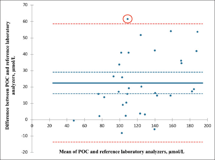 Fig. 4. Bland–Altman plot illustrating the agreement between plasma phenobarbital concentrations measured by the point-of-care (POC) and reference laboratory analyzers. The solid blue line represents the mean bias; the dashed blue lines represent the mean bias’s 95% confidence interval. The dashed red lines correspond to the limits of agreement (mean bias ± 1.96 SD). One outlier is circled in red. On average, the POC analyzer measured phenobarbital concentrations 22.5 µmol/l higher than the reference laboratory analyzer. The systematic proportional bias observed in our study was considered clinically relevant, given the wide 95% limits of agreement (−13.54 to 58.53 µmol/l) and the high rate of discrepant medical interpretations (30%), both of which may significantly influence clinical decision-making. For instance, in one case, the POC analyzer reported a phenobarbital concentration of 185.6 µmol/l, whereas the reference laboratory reported 131.5 µmol/l on the same plasma sample. Based on the POC result, even when applying the IVETF guidelines, the interpretation suggested potential toxicity and could have led to a decision to reduce the daily phenobarbital dosage. In contrast, the result from the reference laboratory remained within its own therapeutic range and below the recommended toxicity threshold, supporting a decision to maintain the current dosage. When not clinically indicated, reducing the dose in such a scenario could risk compromising seizure control without preventing actual toxicity. For all these reasons, our findings suggest that caution should be exercised when using both analyzers interchangeably in clinical practice. Although analytical precision was not independently assessed in our study for either analyzer, the observed systematic bias supports the consistent use of the same analyzer for phenobarbital TDM. Despite the absence of an independent peer-reviewed validation study for phenobarbital measurement on the Catalyst One analyzer, the assay is widely used in veterinary practice and marketed by IDEXX Laboratories as a validated in-clinic method. In addition, a recent method comparison study (Thungrat et al., 2025) demonstrated good agreement between the IDEXX Catalyst Dx analyzer (a closely related platform) and the reference HPLC method. These findings support the analytical reliability of this POC system for phenobarbital monitoring. Further studies evaluating the phenobarbital assay on the Catalyst One analyzer in dogs and cats would help confirm and strengthen its clinical use. Regarding the Cobas 6000 c501 analyzer, although the assay is FDA-approved for human in vitro diagnostics and not specifically validated for veterinary species, it is routinely employed in veterinary diagnostic laboratories for phenobarbital monitoring in dogs and cats, owing to its established analytical performance and broad dynamic range. A lack of agreement between POC and reference laboratory analyzers for various biological parameters has previously been documented in veterinary medicine (Baral et al., 2021; Zuercher et al., 2021; Halman et al., 2025). The underlying reasons for these discrepancies remain unclear and likely multifactorial. We found no significant effect of any assessed clinical or biological variable on the difference between paired plasma phenobarbital concentrations measured by the two analyzers, yet this conclusion should be interpreted with caution. The relatively small sample size may have limited our analyses’ statistical power and increased the influence of individual outliers—as illustrated by one notable case in our study (Fig. 4). Further investigations are warranted to investigate the factors contributing to discrepancies between POC and reference laboratory results under clinical conditions. Thirty-three paired samples from 30 individual dogs and cats were included in this study. Two dogs contributed multiple paired samples, which were retained in the analysis. Our objective was to report as many paired phenobarbital measurements as possible to characterize the overall agreement between both analyzers, without specifically aiming to distinguish between inter- and intra-individual variability. For the first dog, the differences in phenobarbital concentrations between the two analyzers were 18.7, 42.2, and 34.5 µmol/l across three time points. Differences for the second dog were 3.7 and 13.7 µmol/l. While these longitudinal data are too limited to draw generalizable conclusions about intra-individual consistency, it highlights an interesting area for future studies. This study has several limitations, the first being its retrospective design. Because data collection relied on existing medical records from two different institutions, standardization of certain pre-analytical variables—such as sample handling or storage duration—could not be fully ensured across all cases. Despite institutional protocols being consistently followed at both sites, minor variations in analytical procedures, calibration, maintenance, or QC of the POC analyzers, as well as operator-related factors, may have contributed to analytical variability. Notably, although QC of the POC analyzers was not consistently performed on a monthly basis as recommended by the manufacturer, all QC results obtained at both institutions during and after the study period were valid and remained within the acceptable reference ranges. Additionally, paired plasma samples were obtained, analyzed on-site, or sent to the reference laboratory under routine clinical conditions. Unlike in laboratory-based studies, pre-analytical assessment for hemolysis, icterus, and lipemia was not systematically performed using an integrated clinical chemistry system. Degrees of hemolysis, icterus, and lipemia may impact most clinical chemistry assays (Ho et al., 2021; Karin et al., 2023). However, according to both human literature and Cobas 6000 c501 method sheet, plasma phenobarbital concentrations