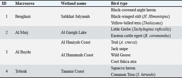 Fig. 1. A map showing the names of the wetlands and lakes in some areas of eastern Libya from which samples were taken: (A) Benghazi (Sabkhat Julyanah), (B) Al Marj (Al Garigh Lake), (C) Al Bayda (AL Haniyah Coast), (D) Al Bayda (Al Hamamah Coast), and (E) Tobruk (Al Tamimi Coast). Table 1. Types of wild migratory birds and wetland areas.