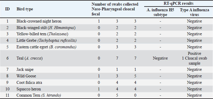 Detection of the avian influenza H5 subtypeLaboratory samples that tested positive for influenza A were retested for influenza H5 subtype by one-step real-time RT-PCR, using the primers and probe sequences that were adapted and selected from Hassan et al. (2022). The primers and probes sequences used to detect the avian influenza H5 subtype in this study are shown in (Table 3). The H5 subtype assay was developed and validated as a one-step procedure using the AgPath-ID One-Step RT-PCR Reagents Kit (Applied Biosystems). The total volume used in each reaction was 15 μl, which included 12.5 μl of master mix with primers and probes and 2.5 μl of extracted nucleic acid. Reverse transcription quantitative PCR (RT-qPCR)To identify influenza A virus in birds, we applied internationally recognized guidelines: the FAO (2023) Animal Health Standards (FAO, 2023), WOAH’s 2022 Diagnostic Manual, and Africa’s veterinary lab protocols for high-risk zoonoses. Through these protocols, a special protocol has been relied upon to diagnose the virus using real-time PCR. Firstly, to detect type A influenza virus, a PCR master mix was prepared with the QuantiTect Probe RT-PCR Kit (Qiagen). The reactions were run on a CFX 96 Touch thermal cycler (Bio-Rad Laboratories, Inc., Hercules, CA) with the following thermocycling profile: the thermal cycling protocol began with an initial reverse transcription step at 50°C for 30 minutes, followed by enzyme activation at 95°C for 15 seconds. This was succeeded by 45 amplification cycles consisting of: denaturation (95°C for 10 seconds), annealing (64°C for 30 seconds with FAM channel signal acquisition), and extension (72°C for 10 seconds). Second, for the detection of Avian Influenza H5 subtype, the PCR master mixtures were prepared with the AgPath-ID One-Step RT-PCR Reagents Kit (Applied Biosystems). The thermocycling settings were protocol started with a 10 minutes incubation at 45°C, followed by initial denaturation at 95°C for 10 seconds. Then, 45 amplification cycles were performed, each consisting of: 15-second denaturation at 95°C, 20 second annealing at 56.5°C (with FAM channel fluorescence capture), and 30-second extension at 72°C. The CFX Manager software (v3.1) automatically determined quantification cycle (Cq) values using its baseline threshold function, and the data were interpreted according to the World Health Organization (WHO) guidelines (WHO, 2016). Specimens with an appropriate RT-qPCR amplification curve and Cq value ≤38 were considered positive according to the guidelines provided by the WHO information for the molecular detection of influenza viruses (WHO, 2017). Ethical approvalThe research proposal was reviewed and approved by the Bioethics Committee at the Libyan Biotechnology Research Center (approval reference number; NBC:001. A.24.10). ResultsThe RT-qPCR test for detecting type A influenza virus was conducted on 11 wild migratory bird species. The species tested included the Black-crowned night heron, Black-winged stilt (Himantopus Himantopus), Yellow-billed tern (Thalasseus), Little Grebe (Tachybaptus), Eastern Cattle Egret (Bubulcus coromandus), Teal (A. crecca), Jacksnipe, Wild Goose, Coot, Squacco heron, and Common Tern (Sterna hirundo) (Fig. 2). Multiple swabs were taken from each bird, consisting of both nasopharyngeal and cloacal samples. Among these, only Teal tested positive for the influenza virus, with the positive result obtained from one cloacal swab. All other bird species returned negative results for Type A influenza virus at the time of sampling, indicating that they were not carrying the virus. (Table 4) showed the laboratory results for avian influenza testing in various bird species. One Teal (A. crecca) tested positive for influenza A virus but negative for the H5 subtype in the follow-up RT-qPCR test. This result points to infection with a non-H5 influenza A strain.”. Table 2. Primer and probe sequences used to detect type A influenza virus by RT-qPCR.