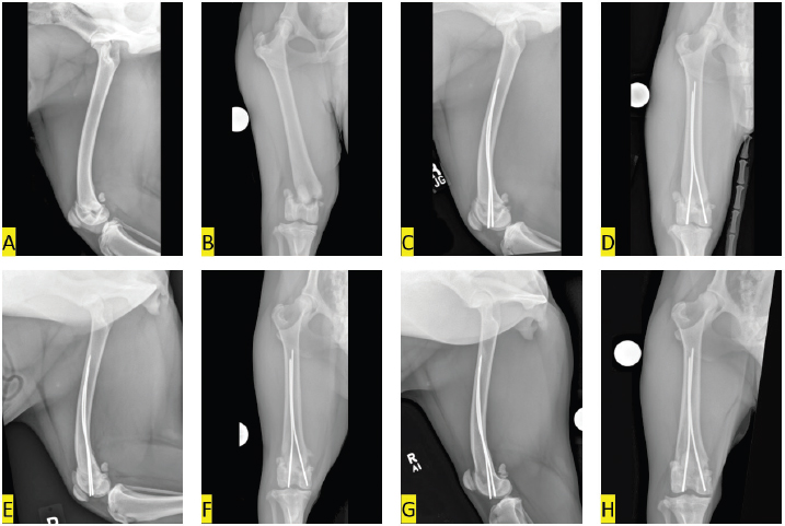Fig. 1. Mediolateral (A, C, E, G) and caudocranial (B, D, F, H) radiographic images of the right femur. (A, B) pre-operative images show a laterally and slightly caudally displaced Salter-Harris type II fracture of the distal femur; (C, D) immediate post-operative images show the distal epiphysis has been nearly anatomically reduced. Two Steinmann pins have been placed in Rush fashion to stabilize the reduced fracture; (E, F) 5-weeks post-operative images of the right femur show the fracture remains reduced and aligned. The fracture margins are ill-defined, indicative of early healing. The Steinman pin in the lateral femoral condyle extends 1 mm distal to the lateral femoral condylar margin, but position of the implants seems otherwise unchanged; (G, H) 9-months postoperative images of the right femur show complete healing of the fracture with nominal stifle osteoarthrosis. DiscussionSuccessful percutaneous pinning of distal femoral physeal fractures has been described, but has primarily been advocated for minimally displaced fractures (Pozzi and Thieman, 2011; Kim et al., 2012; Boekhout-Ta et al., 2017). If the epiphysis is caudoproximally displaced (Tomlinson, 2005), but is still engaged with the metaphysis, the fracture may be amenable to closed reduction by applying traction (Pozzi and Thieman, 2011; Kim et al., 2012; Boekhout-Ta et al., 2017). Final reduction is often achieved by positioning the stifle in flexion and using the tibial plateau to push the femoral condyles cranially while applying a caudally directed pressure to the proximal femoral segment (Olmstead, 1984; Schrader, 1994). The epiphysis in the dog in the current report had displaced laterally and the medial metaphyseal pegs no longer engaged the pyramidal grooves of the epiphysis. Attempts to manually reposition the metaphyseal pegs in the appropriate corresponding pyramidal grooves, using combinations of traction applied to the tibia with angulation were unsuccessful. We were reluctant to continue to attempt manual closed reduction, as excessive forceful manipulations can cause additional physeal damage (Salter and Harris, 1963; Sponseller and Stanitski, 2001; Tomlinson, 2005). Iatrogenic trauma can be mitigated if manipulations are primarily traction (Sponseller and Stanitski, 2001; Kim et al., 2012), so the circular construct was applied to distract the femur through the fracture. Separation of the femoral segments allowed the metaphyseal pegs to disengage from the epiphysis. Rotation of the nuts positioned on the interior surface of the proximal ring on the threaded connecting rods utilized the leverage of the incline plane (Spinney, 1922) to separate the rings to overcome the tension asserted on the epiphysis by the quadriceps and hamstring muscles.