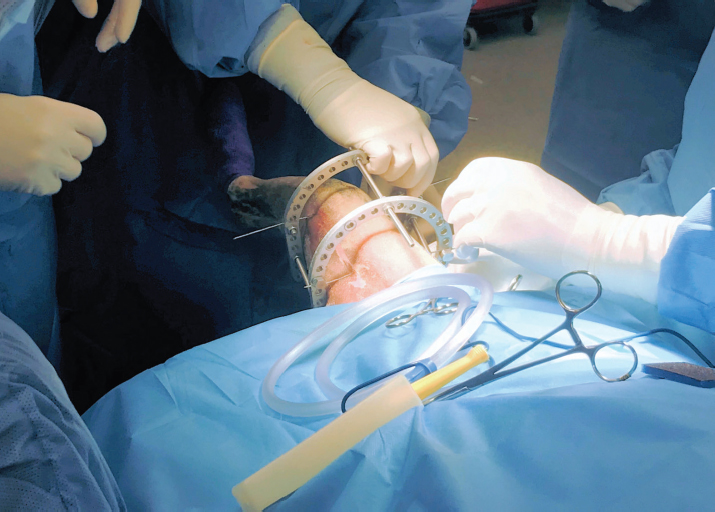 Fig. 2. Intra-operative image of the two-ring circular construct applied to distract the fracture segments. Transient application of circular constructs has been used most commonly to facilitate minimally invasive plate osteosynthesis of antebrachial and crural fractures (Baroncelli et al., 2012; Pozzi et al., 2012, 2013; Hudson et al., 2020), but fixators can also be used to facilitate closed reduction and alignment of humeral and femur fractures (Peirone et al., 2020). Temporary intra-operative application of a trans-articular circular construct has been reported to successfully reduce a markedly displaced Salter-Harris type II fracture of the proximal tibia in a dog (Johnson et al., 2017). The authors of the current case report had previously attempted closed reduction of a type II Salter-Harris fracture of the distal femur using trans-articular application of a circular construct, but angulation of the stifle occurred during distraction and prevented successful indirect reduction. By placing one Kirschner wire in the femoral diaphysis and the other wire in the epiphysis, we were able to distract the fracture sufficiently to disengage the epiphysis and the metaphysis and realign the femur. The wire placed in the epiphysis in the dog in the current report was inserted slightly oblique to frontal plane anatomic axes which may have limited our ability to fully reduce the distracted epiphysis, even when point-to-point reduction forceps were applied, while the fixator was in place. Placing both fixation wires in the mediolateral plane allows for frontal plane translation of the secured bone segments following distraction (Anderson et al., 2003; Lewis and Farese, 2014; Hudson et al., 2020), but overcoming the force of the regional musculature caused substantial bowing of the fixation wires as the construct was distracted which also likely impeded our ability to effectively translate the engaged femoral segments and obtain complete anatomic reduction. We removed the connecting rods and utilized the distal ring as a traction bow (Peirone et al., 2020) to manipulate the epiphyseal segment to improve reduction. The tibia was abducted to obtain optimal frontal plane alignment (Bone, 1994) while we simultaneously flexed the stifle and applied a proximally directed force to the tibia to optimize sagittal reduction.
