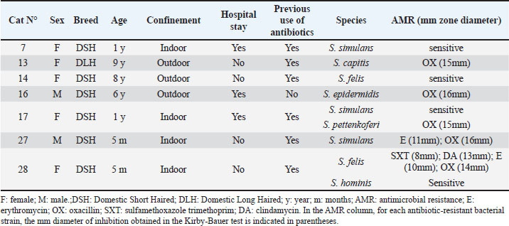 Statistical analysisDescriptive statistics were used to characterize the distribution of the isolated strains and their antimicrobial susceptibility. The association between the epidemiological variables of the patients and the antimicrobial susceptibility of the Staphylococcus strainswas determined using the exact Fisher test, with 95% confidence and a α error of 5% (Di Rienzo et al., 2008). Ethical approvalThe study received the approval of the Scientific Ethics Committee of the South Central Macrozone of the Santo Tomás University (CEC-CS UST), code n°129-21. ResultsOf the 31 healthy cats studied, CoNS was detected in seven of them (prevalence 22.58%). The most frequent variables were: age kitten (45.16%), male sex (58.06%), breed DSH (80.65%), reproductive status (sterilized) (58.06%), and confinement indoor (64.52%). On the other hand, 67.64% of cats have not been hospitalized, and 61.29% have received antibiotic treatment at some point in their lives (Table 2). No association was found between epidemiological variables and Staphylococcus isolation (p > 0.05). Table 2. Absolute (n) and relative (%) frequency distribution of the epidemiological variables and detection of strains CoNS in the 31 patients included in the study.