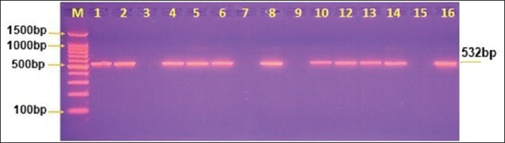 Fig. 2. Image from an agarose gel electrophoresis showing the analysis of theTPI gene by nPCR in fecal samples from G. intestinalis. (M) Marker rung (1,500–100 bp). Lane (1–16) 532-bp nPCR product for G. intestinalis. Two assemblages (genotypes) of G. intestinalis were detected in water buffalo by sequence analysis of 10 positive samples: G. intestinalis assemblage A (5/10) and G. intestinalis assemblage B (5/10) (Figs. 3 and 4) (Table 5). Table 5. NCBI-BLAST homology sequence identity between local G. intestinalis assemblage’s buffalo isolates with G. intestinalis assemblages-related genotypes isolates.