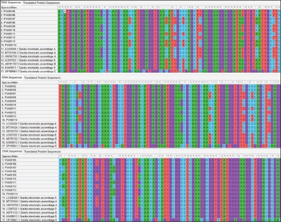 Fig. 3. CLUSTALW was used to compare the partial sequence of the TPI gene in local G. intestinalis Buffalo isolates with NCBIBLAST isolates of G. intestinalis-related genotypes. The TPI gene nucleotide sequences of the buffalo isolates were subjected to multiple alignment analysis, which revealed genetic variation (substitution mutation) and similarity (*).