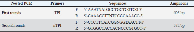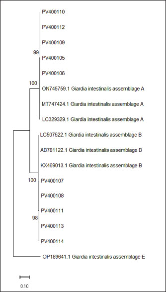 ABSTRACTBackground: Giardia is the most prevalent flagellated protozoan in humans and other mammals. It causes significant economic losses in livestock, including water buffaloes. Aim: This study aimed to determine the prevalence rate of Giardia intestinalis in water buffaloes (Bubalus bubalis) using microscopic and molecular techniques and to detect the genotypes of Giardia isolates from water buffaloes in Iraq. Methods: A total of 180 fecal samples (82 males, 98 females) were collected from water buffaloes in the Babylon province. The microscopic method was used to determine the infection rate of G. intestinalis in water buffalo in the Babylon province. DNA was extracted using the fecal lysis procedure and proteinase K, nested-polymerase chain reaction (PCR) was used to identify the prevalence of Giardia assemblages in water buffalo, targeting the triose phosphate isomerase (TPI) gene. Ten PCR-positive samples were sent for sequence analysis. Results: The infection rate of G. intestinalis was 13.88% using the conventional microscopic method and 30.55% using nested PCR in water buffalo. There was no significant difference in the prevalence of Giardia between males (29.26%) and females (31.63%). The largest infection rate was observed in buffaloes aged 1 year (34.24%), while the lowest was observed in those aged 3 years (26.66%). Phylogenetic analysis identified two genotypes of G. intestinalis, assemblages A and B, in Iraqi water buffaloes. Conclusion: The identification of G. intestinalis assemblages A and B in buffalo indicated that buffalo acts as a reservoir host and may be a source of zoonotic transmission. Keywords: Assemblages, Giardia intestinalis, Prevalence, TPI gene, Water buffalo. IntroductionGiardia intestinalis, duodenalis,and lamblia are common gastrointestinal parasitesin humans and animals worldwide (Feng and Xio, 2011). It has socioeconomic and public health impacts. Giardia is characterized by mild to moderate diarrhea with no symptoms in water buffalo. However, infected buffaloes manifest weight loss, lethargy, and lower productivity. In severe cases, soft stools, a rough coat, intestinal gas, and weight loss may be present (Helmy et al., 2014; Koehler et al., 2014). In humans, most people experience a mild form of giardiasis with no symptoms; nevertheless, persistent diarrhea (steatorrhea), epigastric tenderness, abdominal cramps, flatulence, malabsorption, dehydration, and weight loss may occur in severe cases (Halliez and Buret, 2013). Giardia is spread by the direct oral fecal route, contact with infected mammal feces, and tainted food, water, or drink. The infectious stage of Giardia, the cyst, has been identified in a variety of foods (vegetables, fruit, and meat) and contributes to the spread of illness. It can live in water and soil for several months (Cacciò et al., 2018; Dixon, 2021). Calves are a major source of human infections, and significantly contribute to environmental contamination by releasing large amounts of cysts into the environment and contaminating drinking water sources (Toledo et al., 2017; Alhayali et al., 2020). Different animal species are infected by eight assemblages of G. intestinalis (A–H). Dogs, cats, livestock, and wild animals are the sources of Giardia assemblages A and B that infect humans. Ruminants are believed to be the primary source of giardiasis outbreaks due to their massive fecal production (Wang et al., 2014; Efstratiou et al., 2017; Jian et al., 2018; Bartley et al., 2019; Capewell et al., 2021). Buffaloes are an endangered and significant ruminant species. Similar to other ruminants, G. intestinalis assemblages A, B, and E have been identified as reservoir hosts for giardiasis (Soysal, 2013; Abeywardena et al., 2014; Helmy et al., 2014; Kılınç et al., 2023). Water buffaloes are common in the Southeast Asian region because they are raised for agricultural practices and as meat products with integrated crop-livestock farming systems. They graze in nearby public areas might pollute the environment, resulting in an impact on human or animal health (Perera, 2011). In Iraq, water buffaloes play an important role as a source of milk, meat, manure, and drought power (Obayes et al., 2016; Tokseiit et al., 2023). Few studies have been conducted on the incidence of Giardia in buffaloes and how they may spread zoonotic Giardia species. This study aimed to determine the prevalence of G. intestinalis in water buffaloes (Bubalus bubalis) using both traditional microscopic and molecular techniques. In addition, we sought to identify the genotypes of Giardia isolates through phylogenetic analysis to assess the risk factors for zoonotic transmission in other hosts in the Babylon province, Iraq. Materials and MethodsSample collectionA total of 180 fecal samples (82 males and 98 females) were randomly collected from domestic water buffalo of different ages in Babylon province from March to September 2024. The sampling was carried out using the following protective measures. The fecal samples were stored in a sterile container, sealed tightly, and sequentially numbered along with the sample date, age, and sex. The samples were taken to the parasitology laboratory at the Technical Institute of Babylon of Al-Furat Al-Awsat Technical University, where they were separated into two sections for microscopic analysis and DNA extraction. Microscopic examinationThe microscopic (floatation) method was used to detect the prevalence of G. intestinalis in water buffalo (Uchôaet al., 2018). Molecular techniqueDNA was extracted using the fecal lysis procedure and Proteinase K protocol for the DNA extraction kit for stools according to the manufacturer’s instructions (Bioneer). Subsequently, the extracted gDNA was evaluated using a nano-drop spectrophotometer and stored in a refrigerator at −20C, until it was used for polymerase chain reaction (PCR) amplification. A nested PCR pathway was used for the detection of G. intestinalis assemblages b