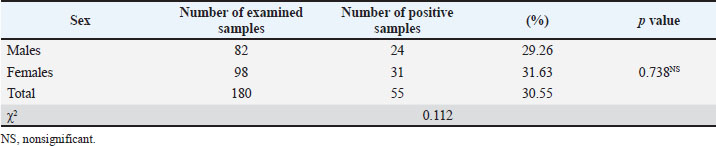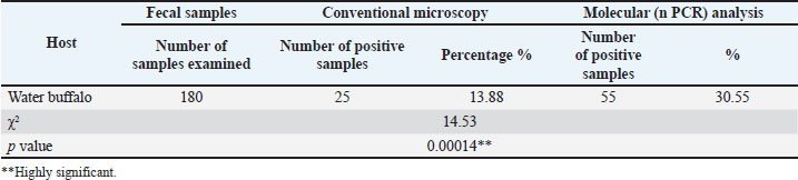 Infection rate of G. intestinalis according to sexNo significant (p > 0.05) difference in G. intestinalis was observed between males (29.26%) and females (31.63%) (Table 3). Table 3. Infection rate of G. intestinalis in water buffalo according to sex.
