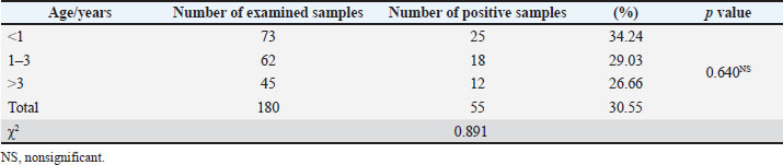 Infection rate of G. intestinalis according to ageA higher infection rate (34.24%) of G. intestinalis was observed in water buffalo less than 1 year old, followed by those between 1–3 years (29.03%), and the lowest infection rate was observed at age >3 years (26.66%), with no significant differences (p > 0.05) (Table 4). Table 4. Infection rate of G. intestinalis in water buffalo according to age.