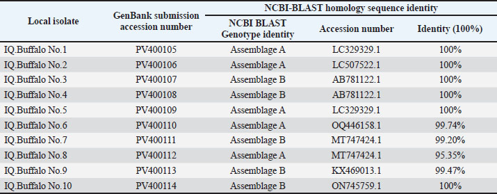 Molecular distribution of G. intestinalis assemblages in water buffaloGenomic DNA obtained from water buffalo fecal samples was used for molecular analysis by nested PCR using TPI gene-specific primers to identify G. intestinalis genotypes. The presence of G. intestinalis was confirmed in all samples by nested PCR, which showed a clear band of 532 bp on an agarose gel electrophoresis (Fig. 2).