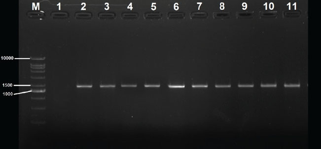 Fig. 1. Amplification of 16S rRNA of 10 K. pneumoniae isolates was fractionated on 1% agarose gel electrophoresis stained with ethidium bromide, Lane M: 1kb ladder marker; Lane1: negative control; Lane2: HK04; Lane3: HK13; Lane4: HK24; Lane5: HK37; Lane6: HK45; Lane7: MK07; Lane8: MK16; Lane9: MK28; Lane9: MK35; Lane10: MK46.