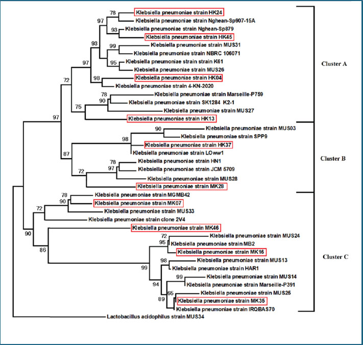 ABSTRACTBackground: Klebsiella pneumoniae is a Gram-negative bacterium that causes several infections, particularly in hospitals and food-borne settings. Aim: This study aimed to investigate the presence of K. pneumoniae in human clinical samples and raw meat from local markets. It also focused on evaluating the antimicrobial resistance patterns, resistance genes, and virulence-related markers. Methods: A total of 198 samples, including 96 from human burns and 102 from raw lamb meat, were analyzed. Klebsiella pneumoniae was isolated and identified using cultural and biochemical tests, followed by polymerase chain reaction (PCR) confirmation of the 16S rRNA gene. Antibiotic susceptibility was assessed using the disk diffusion method, and conventional PCR was used to detect nine resistance genes and six virulence genes. Genetic similarity among isolates was determined using Enterobacterial Repetitive Intergenic Consensus Polymerase Chain Reaction (ERIC-PCR). Results: Of the total samples, 73 were positive for K. pneumoniae, including 37 human isolates and 36 meat isolates. All isolates exhibited high resistance to ampicillin (100%), cefotaxime (94.52%), and erythromycin (89.04%). Common resistance genes included blaTEM (91.78%), sul1 (72.60%), and tetA (57.53%). Virulence genes, such as fimH and use, were also found to be widespread. ERIC-PCR revealed several clusters that contained both human and meat isolates, indicating genetic similarity. Conclusion: These findings confirm the circulation of multidrug-resistant and virulent K. pneumoniae strains across food and human sources. The genetic overlap between sources suggests that food is a potential transmission route. Continuous surveillance and responsible antibiotic use are essential for minimizing public health risks and improving health procedures. Keywords: Beta-lactamase, Capsular, Efflux, Enterobacteriaceae, Nosocomial, Plasmid. IntroductionKlebsiella pneumoniae (K. pneumoniae) is a gram-negative bacterium and the primary pathogen that causes nosocomial infections. Klebsiella pneumoniae can lead to pneumonia, urinary tract infection, bloodstream infection, and meningitis. Klebsiella pneumoniae is also increasingly implicated in community-acquired infections. Community-acquired infections caused by this organism were once thought to be rare. Based on virulence, K. pneumoniae strains can be divided into two morphologically indistinguishable subspecies: classical K. pneumoniae (cKP) and hypervirulent K. pneumoniae (hvKP). cKP strains largely cause nosocomial infections and are therefore endemic in clinical settings. In contrast, hvKP strains can cause community-acquired infections, including liver abscesses, lymphadenitis in neonates, and necrotizing pneumonia, typically in otherwise healthy individuals (Beig et al., 2024). Klebsiella pneumoniae is a bacterial pathogen associated with pneumonia, bloodstream infections, and urinary tract infections. Klebsiella pneumoniae has developed resistance mechanisms to many antibiotics, mainly through horizontal gene transfer, β-lactamases, efflux pumps, and mutations (Karami-Zarandi et al., 2023). The rise of hypervirulent strains carrying plasmid genes such as rmpA/rmpA2 and strong iron uptake systems has made infections more severe and difficult to treat (Kocsis, 2023; Al-Deresawi et al., 2024; Hu et al., 2024). Antibiotic resistance in bacteria and its consequences have become a global public health threat. An alarming increase in antibiotic-resistant bacteria has been reported globally. Klebsiella pneumoniae is one of the organisms with the most serious increased antibiotic resistance, leading to increasing numbers of CPKP-related infections (Li et al., 2023; Rahmat Ullah et al., 2024). Antibiotic resistance is primarily conferred by either chromosomal mutations or plasmid-mediated gene transfer (Li et al., 2024). The recruitment of resistance plasmids is often envisioned as a co-evolution process in which an antibiotic-susceptible bacterial strain acquires an antibiotic-resistant plasmid epidemic strain. One of the greatest concerns is that a CRKP ID50 cultured in the absence of the selective pressure of antibiotics could revert back to a carbapenem-susceptible strain, rendering whole-population antibiotic therapy ineffective (Nang et al., 2024). Klebsiella pneumoniae is equipped with polysaccharide capsules that protect against phagocytic uptake and complement attack, allowing the bacteria to colonize their host. In recent decades, K. pneumoniae infections have become more difficult to treat due to the emergence of antibiotic-resistant strains. Beta-lactams are the most commonly used antibiotics to treat K. pneumoniae infections; however, this pathogen has been equipped with a variety of mechanisms to avoid beta-lactam antibiotics, resulting in treatment failure (Stojowska-Swędrzyńska et al., 2021). Klebsiella pneumoniae resistance to beta-lactam antibiotics primarily results from the production of β-lactamase, allowing for widespread resistance to most β-lactam antibiotics. Klebsiella pneumoniae produces many β-lactamases, including 66 types that can break down penicillins, cephalosporins, carbapenems, and aztreonam (Lin et al., 2024). Both plasmid-borne enzymes and chromosomal β-lactamases, such as cephalosporinase and penicillinase, are common in this species. In classical strains, resistance to β-lactams is often linked to extended-spectrum β-lactamases, cephalosporinase, or carbapenemases. Recent reports have described hvKP strains with a new mechanism that alters β-lactam–binding proteins, making treatment more difficult. This pathogen can also resist aminoglycosides, fluoroquinolones, and colistin (Al-Deresawi et al., 2022; Qin et al., 2024; García-Cobos et al., 2025). In this study, we investigated K. pneumoniae in human clinical samples and raw meat. It assessed antibiotic resistance, detected resistance and virulence genes, and compared hvKP with cKP. Materials and M