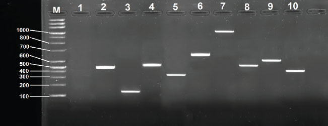 Fig. 3. Detection of antibiotic resistance genes in K. pneumoniae isolate MK16 by PCR, electrophoresed on 1.5 % (w/v) agarose gel. Lane M: 100-bp DNA ladder. Lane 1: Negative control. Lane 2: aac(6)-Ib gene. Lane 3: the blaTEM gene. Lane 4: aadA1 gene Lane 5: mphA gene. Lane 6: ermB Lane 7: nfsA gene. Lane 8: tetA gene Lane 9: catA gene. Lane 10: qnrS gene Table 7. Antimicrobial resistance genes in Klebsiella pneumoniae.