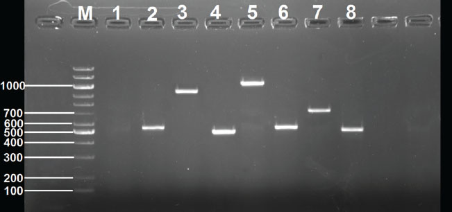 Fig. 4. Detection of virulence genes in K. pneumoniae isolate MK07 by PCR, electrophoresed on 1.5 % (w/v) agarose gel. Lane M: 100-bp DNA ladder. Lane 1: Negative control. Lane 2: aer gene. Lane 3: iucB gene. Lane 4: fimH gene. Lane 5: magA gene. Lane 6: rmpA gene. Lane 7: wabG gene. Lane 8: ureA gene. The presence of fimH and uge virulence genes in most isolates suggests strong adhesion and colonization potential. These traits are critical for initiating urinary tract and bloodstream infections, as supported by other studies from Southeast Asia and Europe (Håkonsholm et al., 2022). The wabG gene, which is involved in lipopolysaccharide synthesis, was also common among our isolates. Its presence enhances the bacterium’s ability to evade host immunity and is associated with severe forms of infection (Håkonsholm et al., 2022; Voellmy et al., 2022). The detection of rmpA and kfu genes in meat and human isolates reflects the increasing spread of hypervirulent K. pneumoniae (hvKP). These genes are often found in strains capable of causing liver abscesses and invasive disease even in healthy individuals (Lansbury et al., 2020; Li et al., 2022; Kocsis, 2023). The entB gene was present in more than half of the isolates. It plays a major role in iron acquisition via siderophore systems, which are essential for host tissue survival. Previous studies have shown that iron uptake systems are key virulence features of both classical and hvKP (Voellmy et al., 2022). The coexistence of multiple virulence genes in food isolates is alarming. Foodborne strains are not only resistant but also potentially hypervirulent. This agrees with findings from food protection studies where virulent and resistant strains were recovered from ready-to-eat products (Siu et al., 2011).