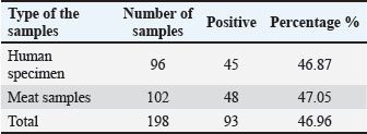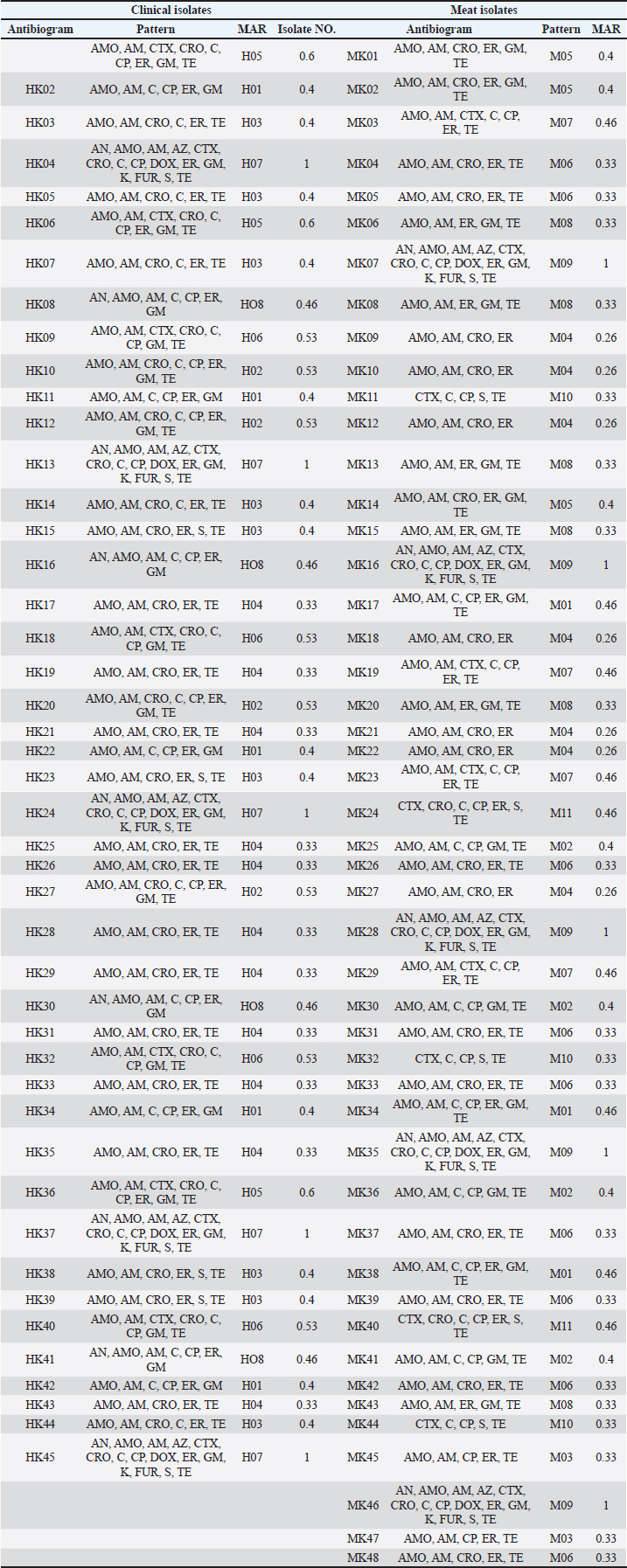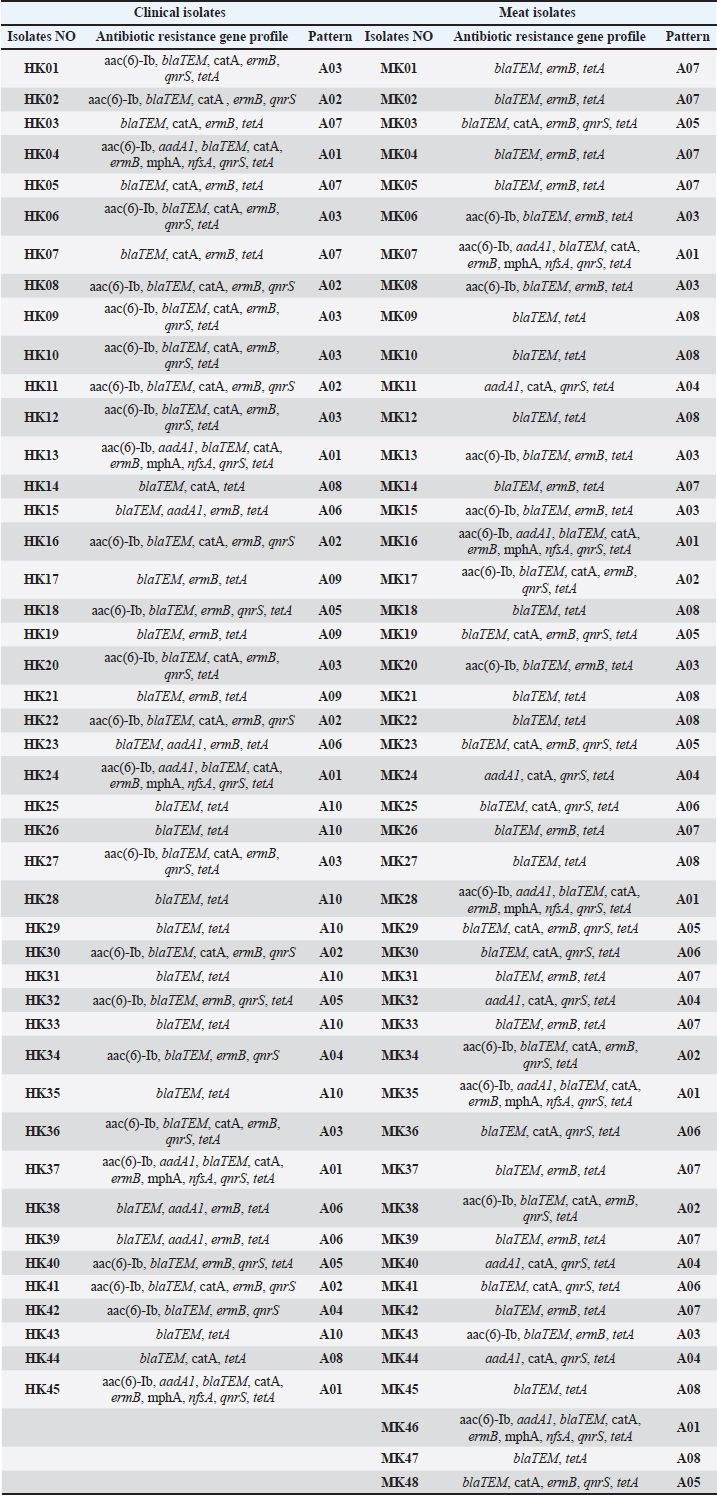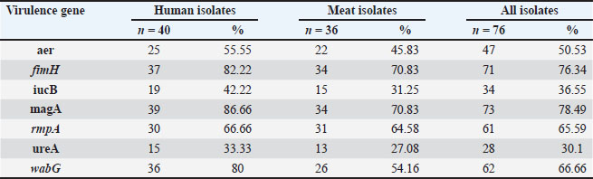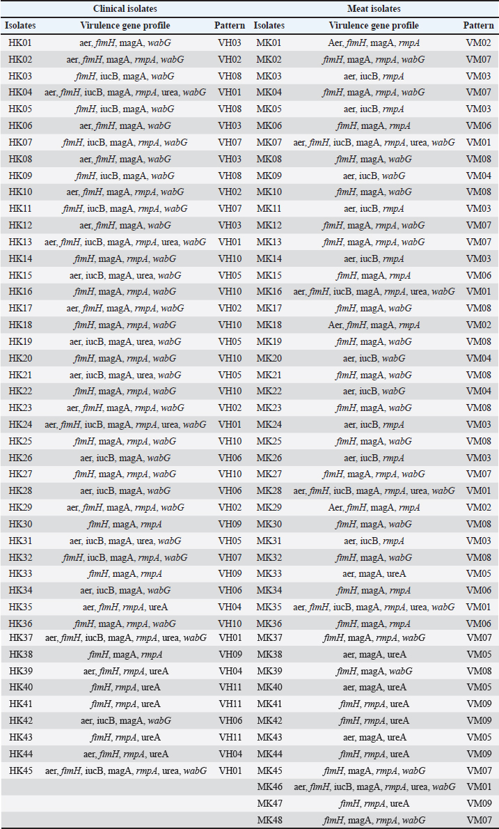 Table 10. Virulence gene pattern in K. pneumoniae isolates from clinical sources and meat from the market.