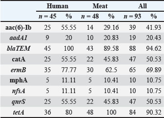 DiscussionThe results confirmed a high occurrence of K. pneumoniae in both human and meat samples (Morante et al., 2021). The nearly equal distribution of isolates between clinical and food sources highlights this bacterium’s wide environmental adaptability. These findings are consistent with those of prior work in India, where K. pneumoniae was isolated from a variety of sources with similar prevalence and resistance trends (Karim et al., 2018). The high recovery rate in meat samples is consistent with reports from Iran (Eghbalpoor et al., 2019) and China (Yang et al., 2021) showing that retail meat can act as a vehicle for K. pneumoniae transmission to humans, especially when food hygiene is poor. Identification of this bacterium in food products calls for more rigorous monitoring of animal-sourced foods in markets and slaughterhouses. All isolates in this study were confirmed by 16S rRNA PCR, and the confirmation rate supported the reliability of classical and biochemical methods as a first-line identification tool. However, molecular testing remains essential for definitive classification and should be incorporated into surveillance programs (Bobbadi et al., 2021). Antibiotic susceptibility data revealed concerning levels of MDR. The universal resistance to ampicillin and high resistance to cephalosporins and macrolides agree with global trends showing increasing treatment challenges in both hospitals and communities (Yang et al., 2021). Resistance was high across both human and meat isolates. This reinforces the possibility of antibiotic misuse in livestock production, contributing to resistant strains that enter the food chain and affect human health, as noted in previous meat-related K. pneumoniae studies (Robicsek et al., 2005; Siu et al., 2011). The detection of blaTEM, sul1, and tetA genes in most isolates confirms the molecular basis of the observed resistance. These genes are widely distributed in gram-negative pathogens and are often located on mobile genetic elements, supporting the idea of gene transfer between clinical and environmental strains (Morante et al., 2021). The presence of qnrS and ermB genes in a considerable number of isolates indicates resistance to quinolones and macrolides. In recent years, these genes have been frequently reported in hospital-acquired and foodborne K. pneumoniae isolates (Pham et al., 2024). Their spread is linked to plasmid transfer and antibiotic pressure. Identification of multiple resistance genes in single isolates is of particular concern. This indicates the co-selection and persistence of resistance traits under antibiotic exposure. Similar findings have been described in bloodstream and urinary isolates in other regions (Yang et al., 2021). The genetic basis of resistance in our isolates aligns with genomic studies that have found large plasmids harboring resistance and virulence gene clusters. These mobile elements increase bacterial adaptability and complicate treatment (Li et al., 2022). Table 8. Antimicrobial resistance gene pattern of K. pneumoniae.