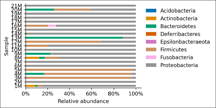 Fig. 2. Relative abundance of representative taxa identified from uterine biopsy samples at the phylum level. The figure shows the average proportion of Proteobacteria, Firmicutes, Actinobacteria, Bacteroidetes, Acidobacteria, Fusobacteria, and Deferribacteres.