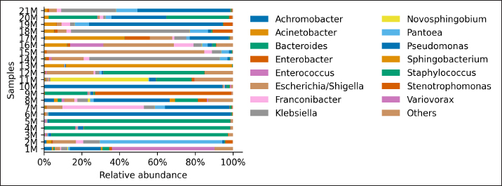 AbstractBackground: Culture-independent techniques have made it possible to expand the knowledge about the composition of bacterial communities present in the healthy uterus and their role in health and disease, mainly in humans. However, in animals like mares, there is a dearth of information regarding this area. Aim: To narrow this knowledge gap, the objective of this study was to identify and characterize the composition and function of the uterine microbiome of a group of Chilean purebred mares (CPM), an equine breed with the oldest genealogical record in South America and an economical important reproductive industry. Methods: From uterine biopsy samples obtained during estrus, DNA extraction and targeted sequencing were performed to investigate the bacterial diversity and its probable metabolic function. Results: CPM biopsy samples were characterized by having a varied microbial composition, where the four most relatively abundant phyla were Proteobacteria (69.6%), Firmicutes (21.1%), Bacteroidetes (7.8%), and Actinobacteria (1.06%); which made up 99.6% of the total identified phyla. In contrast, Actinobacteria and Fusobacteria were the phyla not identified in all samples. Of a total of 59 genera identified across all samples, Staphylococcus was the most abundant genus with an average relative abundance of 18.88%, followed by Pseudomonas (17.9%), Escherichia/Shigella (10.42%), and Klebsiella (9.92%). Conclusion: These findings contribute to the knowledge of microbes’ presence in the uterus, while future studies are required to demonstrate the role of these microorganisms in health and disease. Keywords: Uterine microbes, Mare, Metabolic pathways. IntroductionDuring the last years, it has been shown that the healthy uterine epithelium is not sterile as it was believed during the 1990s (Tessier, 1900; Baker et al., 2018). The microbes identified from uterine samples are taxonomically diverse and some of them are capable of growing in culture (Costa and Weese, 2019; Shanahan et al., 2021). However, culture-dependent microbial characterization is limited since not all microorganisms manage to grow in vitro (Shanahan et al., 2021). Difficult-to-grow microorganisms have redirected the study of the microbiome to use 16S ribosomal RNA sequencing (Peterson et al., 2009), which has made it possible to detect bacteria that, by their nature, take a long time or do not grow in conventional cultures (Ferris et al., 2010; Yang et al., 2017). In humans, evidence of the presence of endometrial microbes suggests they might play a relevant role at the time of embryo implantation, through the regulation of endometrial cell function and the local immunity response. It might help also to prevent the growth of pathogenic microorganisms through the protection of the epithelium (Benner et al., 2018). However, the complete role of microbiomes in the reproductive tract is still not fully understood. It has been suggested that a change in microbial composition and the presence or absence of some bacterial species could help in the maintenance and completion of a pregnancy (Heil et al., 2019; Lozano et al., 2021). In mares, a correlation has been observed between microbes in the endometrium and the reproductive state, where the presence of bacteria of the phyla Proteobacteria and Bacteroidetes was positively associated with pregnancy health (Sathe et al., 2017). In addition, other authors have identified from uterine samples of healthy mares the presence of bacteria of the phyla Proteobacteria, Firmicutes, Bacteroidetes, and Actinobacteria (Sathe et al., 2017; Schnobrich et al., 2017; Heil et al., 2019). Therefore, the identification and characterization of microbes from the uterine epithelium can help to understand its role in health and disease. However, the presence of microbes from uterine samples does not relate to an established microbiome, and the identified taxa might come from contaminated reagents and environments other than the uterus (Kim et al., 2017; Olomu et al., 2020; Blaser et al., 2021). Several studies have directly or indirectly associated dysbiosis or bacterial abundance alterations with subfertility (Heil et al., 2019), premature birth (Puente et al., 2020; Morimune et al., 2021), and early mortality in different species, including humans (Goldenberg et al., 2000; Lawn et al., 2005; Moore et al., 2017; Yang et al., 2017; Lyman et al., 2019; Bardos et al., 2020). In mares, bacterial endometritis is recognized as the main cause of infertility, causing a decrease in reproductive efficiency and therefore, a substantial economic loss (Causey, 2006; Troedsson and Woodward, 2016; Ferris et al., 2017; Heil et al., 2019; Gallego et al., 2020). Culture-dependent studies of the uterine epithelium have indicated a predominance of Enterobacteriaceae in mares with endometritis (Ferrer and Palomares, 2018) a family of the gamma-proteobacteria phylum that include Escherichia coli, Salmonella, Shigella, and Klebsiella. In Chilean purebred horses, it is common for them to start their reproductive life late, causing elderly and multiparous mares to remain in use as breeders. Therefore, a positive association between endometritis, age, and the number of deliveries has been reported, possibly related to E. coli being the most frequently isolated microorganism using conventional culture techniques (Morales and Castro, 2018). Despite the economic importance of Chilean purebred mares (CPM) in Chile, there are no previous reports describing the identification of microbes from uterine samples. In this study, we identified and predicted the metabolic capabilities of bacteria from biopsy samples for a group of CPM, using targeted next-generation sequencing and bioinformatics analyses. Materials and MethodsThis study was carried out in Chile, in the Maule region (35°25ʹS, 71°39ʹW) during the month of October 2021, which presented days of 14.1 hours of light and 9.9 hours of darkness, with an average temperature