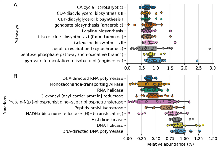 Fig. 4. PICRUSt2 inferred abundance of metabolic genes per sample. Distribution of the 10 most abundant metabolic genes associated with pathways (A) and functions (B) using the MetaCyc annotation. The shown pathways contribute 0.67% and functions contribute 0.38%, on average to each sample. The predicted metabolic pathways present in the group of mares studied were those related to common bacterial metabolic functions, such as cell wall and membrane biosynthesis, carbon catabolism, and pyrimidine recovery (Mio et al., 1999; Rodionova et al., 2012; Cámara et al., 2013; Okesli et al., 2017). The unaltered abundance of pathways related to virulence factors is consistent with the fact that the group studied was made up of mares without uterine pathologies. In perspective, a study that compares the microbiome of a group of mares without reproductive pathologies with another that presents reproductive disorders would be necessary; this would help to understand the role of bacteria in the reproductive environment in states of health and disease; considering a strict sampling protocol, to avoid cross-contamination of the sample with fecal material (Kim et al., 2017; Olomu et al., 2020; Blaser et al., 2021). ConclusionThe targeted sequencing and bioinformatics analysis of 21 uterus biopsy samples of CPM identified seven phyla and 59 genera. Proteobacteria was the phylum with the highest relative abundance, while Staphylococcus was the genus most represented and identified in all samples. AcknowledgmentsThe authors acknowledge Agencia Nacional de Investigación y Desarrollo (ANID, Ministerio de Ciencia, Tecnología, Conocimiento e Innovación, Chile), Project PAI #77190079. Conflict of interestThe authors have no conflict of interest to declare. Author contributionsPamela Thomson: Project Administration, Conceptualization, Methodology, Validation, Formal Analysis, Data Curation, Writing – Original Draft, Review & Editing. Funding Acquisition, Investigation. Josefina Pareja: Data Curation, Writing – Original Draft. Andrea Núñez: Investigation, Writing – Original Draft, Data Curation, Methodology. Rodrigo Santibáñez: Bioinformatics Analyses, Statistic Analyses, Writing – Review & Editing. Rodrigo Castro: Investigation, Conceptualization, Methodology, Validation, Data Curation, Review & Editing. ReferencesAllen, J.L., Begg, A.P. and Browning, G.F. 2011. Outbreak of equine endometritis caused by a genotypically identical strain of Pseudomonas aeruginosa. J. Vet. Diagn. Invest. 23, 1236–1239. Bafana, A., Krishnamurthi, K., Patil, M. and Chakrabarti, T. 2010. Heavy metal resistance in Arthrobacter ramosus strain G2 isolated from mercuric salt-contaminated soil. J. Hazard. Mater. 177, 481–486. Baker, J.M., Chase, D.M. and Herbst-Kralovetz, M.M. 2018. Uterine microbiota: residents, tourists, or invaders? Front. Immunol. 9, 1–16. Bardos, J., Fiorentino, D., Longman, R.E. and Paidas, M. 2020. Immunological role of the maternal uterine microbiome in pregnancy: pregnancies pathologies and alterated microbiota. Front. Immunol. 10, 1–14. Bassetti, M., Echols, R., Matsunaga, Y., Ariyasu, M., Doi, Y., Ferrer, R., Lodise, T.P., Naas, T., Niki, Y., Paterson, D.L., Portsmouth, S., Torre-Cisneros, J., Toyoizumi, K., Wunderink, R.G. and Nagata, T.D. 2021. Efficacy and safety of cefiderocol or best available therapy for the treatment of serious infections caused by carbapenem-resistant gram-negative bacteria (CREDIBLE-CR): a randomised, open-label, multicentre, pathogen-focused, descriptive, phase 3 trial. Lancet. Infect. Dis. 21, 226–240. Bello-López, E., Rocha-Gracia, R.D.C., Castro-Jaimes, S., Cevallos, M.Á., Vargas-Cruz, M., Verdugo-Yocupicio, R., Sáenz, Y., Torres, C., Gutiérrez-Cázatrez, Z., Arenas-Hernández, M.M. and Lozano-Zarain, P. 2020. Antibiotic resistance mechanisms in Acinetobacter spp. strains isolated from patients in a paediatric hospital in Mexico. J. Glob. Antimicrob. Resist. 23, 120–129. Benner, M., Ferwerda, G., Joosten, I. and Van der Molen, R. 2018. Uterine microbiome and endometrial receptivity. How uterine microbiota might be responsible for a receptive, fertile endometrium. Hum. Reprod. Update. 24, 393–415. Blaser, M.J., Devkota, S., McCoy, K.D., Relman, D.A., Yassour, M. and Young, V.B. 2021. Lessons learned from the prenatal microbiome controversy. Microbiome 9, 1–7. Callahan, B.J., McMurdie, P.J., Rosen, M.J., Han, A.W., Johnson, A.J.A. and Holmes, S.P. 2016. DADA2: high-resolution sample inference from illumina amplicon data. Nat. Methods. 13, 581–583. Callahan, B.J., McMurdie, P.J. and Holmes, S.P. 2017. Exact sequence variants should replace operational taxonomic units in marker-gene data analysis. ISME. J. 11, 2639–2643. Cámara, Y., González-Vioque, E., Scarpelli, M., Torres-Torronteras, J. and Martí, R. 2013. Feeding the deoxyribonucleoside salvage pathway to rescue mitochondrial DNA. Drug. Discov. Today. 18, 950–957. Caporaso, J.G., Kuczynski, J., Stombaugh, J., Bittinger, K., Bushman, F.D., Costello, E.K., Fierer, N., Gonzalez Pena, A., Goodrich, J.K., Gordon, J.I., Huttley, G.A., Kelley, S.T., Knights, D., Koenig, J.E., Ley, R.E., Lozupone, C.A., McDonald, D., Muegge, B.D., Pirrung, M., Reeder, J., Sevinsky, J.R., Turnbaugh, P.J., Walters, W.A., Widmann, J., Yatsunenko, T., Zaneveld, J. and Knight, R. 2010. QIIME allows analysis of high-throughput community sequencing data. Nat. Methods. 7, 335–336. Causey, R.C. 2006. Making sense of equine uterine infections: the many faces of physical clearance. Vet. J. 172, 405–421. Chai, A., Yuan, L., Li, L., Shi, Y., Xie, X., Wang, Q. and Li, B. 2020. Aerosol transmission of Pseudomonas amygdali pv. lachrymans in greenhouses. Sci. Total. Environ. 748, 141433. Comeau, A.M., Douglas, G.M. and Langille, M.G.I. 2017. Microbiome helper: a custom and streamlined workflow for microbiome research. MSystems 2, 1–11. Costa, M. and Weese, J.S. 2019. Methods and basic concepts for microbiota assessment. Ve
