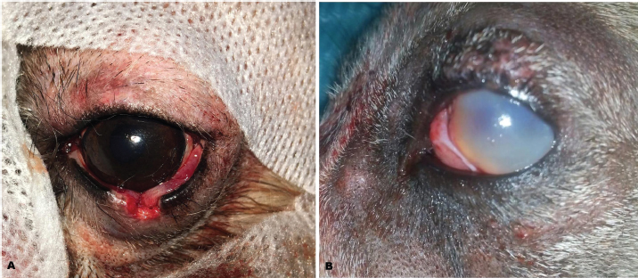 Fig. 2. Images of the eyes of (A) an 18-month-old male Griffon and a (B) 2-year-old mixed breed dog after successful globe replacement surgery. (B) Note the persistence of corneal edema associated with the eye of the mixed breed dog. Endoscopic findingsEndoscopic examination of the anterior segment of the Pekingese dog presented with primary glaucoma (seven days following GRS) revealed thickening of the pectinate ligament of the iridocorneal angle (ICA) with multiple well-defined small iris strands arising from the base of the iris and crossing the pectinate ligament to insert in the inner cornea (Fig. 4A). The endoscopic evaluation of the posterior segment revealed premature capsular cataract, attenuation of the retinal blood vessels, tapetal hyper-reflectivity, and possible atrophy of the optic nerve (Fig. 4B).