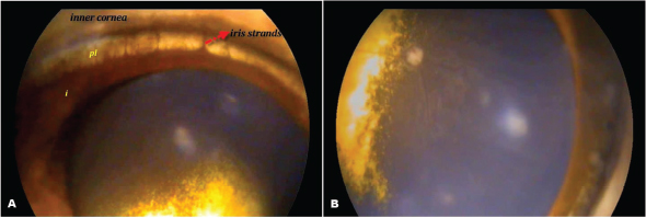Fig. 4. (A) An endoscopic image of the anterior chamber and iridocorneal angle of an 18-month-old Pekingese (diagnosed with glaucoma) 7 days after globe replacement surgery illustrating abnormal thickening of the pectinate ligament (pl) at the trabeculum with small iris strands arising from the base of the iris (i), crossing the pectinate ligament and inserting in the inner cornea. (B) An endoscopic image of the fundus of the same eye illustrating attenuation of the retinal blood vessels, tapetal hyper-reflectivity and atrophied optic nerve.