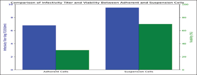 Sterility testSterility tests conducted on cell pellets and media using bacteriological and mycotic media such as BHIB, Thioglycolate, TSB, and TSA confirmed the absence of bacterial or fungal contamination after 14 days of incubation at 35°C. Additionally, real-time PCR analysis revealed that all cell culture components, including BHK-21 and BHK-S cells, tested negative for mycoplasma contamination, ensuring the sterility and integrity of the cell culture system as seen in Figure 5. Cryopreservation of BHK-S cellsPost-thaw viability assessment of cryopreserved BHK-S cells revealed robust recovery characteristics. After 24 hours of culture, the cells exhibited a viability of 90%, with the VCD reaching 0.6 × 105 cells/ml. These results indicate successful preservation of cell functionality and growth potential following the cryopreservation process. Propagation and infectivity of FMDVAdaptation of BHK-21 cells to suspension culture significantly improved FMDV production compared with conventional adherent cultures. The infectivity titration of each FMDV harvest was measured at each passage, together with the VCCs and viability percentages. Although adherent BHK-21 cells achieved a maximum virus titer of 106.8 TCID50/ml, suspension-adapted cells consistently produced higher virus yields across multiple passages, with a mean titer of 7.88 ± 0.73 log 10 TCID50/ml, as illustrated in Figure 6. The highest virus titer (109·5 TCID50/ml) was achieved in passage 1 (P1), coinciding with peak cell viability (70%). Statistical analysis revealed a strong positive correlation between virus titer and cell viability (r=0.967, p < 0.001), particularly evident in early passages. Subsequent passages maintained elevated titers ranging from 107·0 to 108·75 TCID50/ml, representing a consistent 2–3 log increase over adherent culture yields. VCD stabilized at 5.72 × 105 cells/ml in later passages (P6–P10), whereas cell viability fluctuated between 26% and 53%. Notably, a secondary productivity peak occurred at P9 (108·25 TCID50/ml) with 53% cell viability, demonstrating the robustness of the adapted cells for sustained virus production, as in Figure 7. The suspension culture system maintained stable virus production despite varying cell viability (mean: 41.80%), with VCD remaining consistent (mean: 4.95 × 105 cells/ml) throughout later passages. This stability, combined with significantly enhanced virus yields, indicates the successful adaptation of BHK cells for efficient FMDV propagation in suspension culture. These results demonstrate that suspension-adapted BHK cells provide a superior platform for FMDV production, offering both enhanced virus yields and process consistency suitable for industrial-scale vaccine manufacturing.