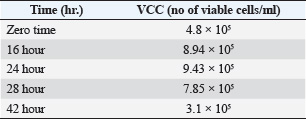 X: VCD (per ml); t: time points of sampling (hour); n and n-1: two consecutive sampling points. Sterility testThe cell seeds will be investigated in a specific culture medium (Thioglycolate, Tryptic Soy Broth (TSB), Tryptic Soy Agar (TSA), and Brain Heart Infusion Broth) in terms of microbial and mycotic contamination at a specified time (Nema and Khare, 2012). A mycoplasma test using a real-time PCR kit [Mycoplasma 16S ribosomal RNA gene (genesig® standard kit)] revealed that the cells, medium, and FBS were free from mycoplasma. Cryopreservation of BHK-S cells after every passageA total of 10 ml of adapted BHK-S cells was added to a Falcon tube (15 ml, Greiner®) and centrifuged (cooling centrifuge, BioBase®) at 300 × g for 10 minutes. The cells were pelleted, the supernatant was discarded, and the pellet was resuspended in freezing medium containing 90% F.B.S. and 10% DMSO. The mixture was then aliquoted into a myotube and preserved in a Mr. Frosty ® freezer at −80°C; after 24 hours, the myotubes with frozen cells were transferred to a liquid nitrogen tank (−196°C). The cryopreserved cells were subsequently revived and transferred to a shaker flask containing growth medium and incubated at 37°C for 24 hours. A sample of growing suspended cells was taken for the calculation of viability and VCD. Propagation and titration of FMDVThe FMDV vaccine strain O/Egypt/sharqia/72 (manisa lineage strain) was obtained from the Animal Health and Research Institute, Egypt, 2021 (VV). Both adherent BHK-S cells and BHK-S cells at every passage were infected with FMDV O/Egypt/sharqia/72 (manisa lineage strain) at a multiplicity of infection (MOI) of 0.001. The supernatants from infected cultures of BHK-S will be harvested at 16, 20, or 24 hours post-infection (hpi). VCD of infected BHK-S and FMDV infectivity titrationFMDV titers harvested from every passage of BHK-S and adherent BHK were determined via endpoint titration using the Spearman–Kärber calculation and expressed as the tissue culture infective dose affecting 50% of the cultures (TCID50) per ml (Lei et al., 2021). Each experiment was performed in triplicate. Confirmation of virus propagation and titration via PCRViral RNA extraction and RT-PCRVirus harvested from every passage (200 µl) was extracted via RNA extraction using the Easypure® Viral DNA/RNA Kit (Transgene, Cat No ER201-01) according to the manufacturer’s protocol. All samples, the positive control (initial virus stock), and the negative control were then subjected to one-step RT-PCR via COSMO RT-PCR master mix (Willow fort, Cat NO. WF10204002) with the specific primer Serotype O (1D/2B region) as its sequence shown in Table 1. The reaction was subjected to one cycle of 95°C for 5 minutes followed by 45 cycles of 94°C for 30 seconds and 46°C for the Serotype O primers, followed by 72°C for 1 minute, and finally, one cycle of 72°C for 10 minute as the final extension cycle (Table 1). The PCR products were electrophoresed on a 1% agarose gel, followed by ethidium bromide staining and visualization with a UV Trans-illuminator (El-Kholy et al., 2007; El-Shehawy et al., 2011). Scaling up to a bioreactor volume of 10 mlA scale-up study was performed using stirred glass tank bioreactors. Briefly, a 10-l volume bioreactor (Eppendorf®) was filled with 5-l Brescia’s Eagle’s Medium containing (5% NEAA for cell culture, 5% vitamins, and 7% newborn calf serum), which was inoculated. There were 3.57 × 105 live BHK-S cells/ml (27%). The temperature and pH of the bioreactor were controlled at 37°C, and 7.2 ± 0.2, respectively. The dissolved oxygen was controlled through cascade control of the air flow rate (0.1–1.0 vvm). The agitation speed of the impellers was 80 rpm. Sampling every 16, 24, 48 hours for cell count and viability of BHK-S. After 3 days of culture, the BHK-S cells were allowed to settle without agitation for 12 hours, and 80% of the old medium was replaced with fresh medium. After medium exchange, cells were infected with FMDV at an MOI of 0.001, and infected cultures were harvested at 19 hpi for FMDV quantification. Table 1. Shows the sequences of specific primers for the 1D/2B region of FMDV serotype O.
