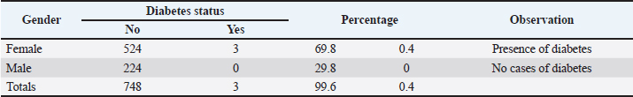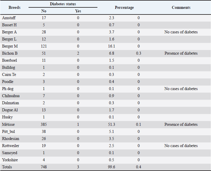 Diabetic status of canines according to the condition scoreWe cross-referenced the diabetic status with the body condition score to determine whether there was a link. Table 5 presents the results of this analysis. The analysis of the table reveals that dogs with diabetes were only represented by individuals with a lean (0.3%) and normal (0.1%) body condition score. No obesity was observed among the recorded cases of diabetes. This indicates that the obese dogs in our sample did not develop diabetes. However, this hypothesis must be interpreted with caution. The chi-square test (u03c7²) (χ²=10.896; ddl=2; p=0.004 < 0.05) showed a statistically significant difference between the different classes of the body condition score, suggesting an association between this variable and the occurrence of DM in dogs. Thus, although no obese dogs were diagnosed with diabetes during this study, the distribution of cases according to body condition indicates a probable influence of this factor. Diabetic status of canines as a function of reproductive statusTable 6 shows that only non-gonadectomised dogs appear to develop diabetes. Although a potential link between diabetes and gonadectomy status is often suggested, the statistical test failed to confirm this association (p=0.626). Thus, the risk of developing diabetes in gonadectomised dogs could be linked to other factors that have not yet been identified. Diabetic status of dogs according to the breedWe cross-referenced diabetic status with the different breeds of dogs encountered to assess any trends. Table 7 shows the results of this analysis. Of the 21 breeds listed, only two seemed likely to develop diabetes in the commune of Cocody : the Bichon Bolonais and mixed-breed dogs. This could be due to genetic predisposition or local racial distribution. However, statistical analysis of the occurrence of diabetes among the breeds revealed no significant difference (p=0.678). Diabetic status of canines according to the food typeThe diabetic status of the dogs was compared with the types of food they ate, as shown in Table 8. The results in this table indicate that dogs fed a mixed diet are more likely to develop diabetes. This mixed diet is made up of both industrial foods (Everland, Dr Clauder’s, Royal Canin, Vitalize, Dog Donald, etc.) and local foods (rice, vermicelli, attiéké, chicken, fish, eggs, etc.). Gender-related diabetic statusThese results are presented in Table 9. This table shows that only female patients developed diabetes. The chi-square test (u03c7²) revealed no significant difference between the prevalences according to sex at the 5% threshold (χ²=1.280; ddl=1; p=0.258 > 0.05), suggesting that sex is not a determining factor in the onset of diabetes. This discrepancy could be explained by the influence of the sexual cycle on insulin action in females and by the diagnostic methods used. Table 7. Diabetic status of dogs according to breed.