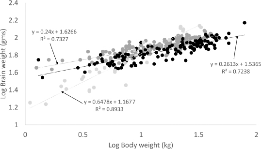 Fig. 1. Brain weight scales with body weight to the 0.26 power in dogs. The black dots and line represent domestic dogs from the current study, dark gray dots and line represent domestic dogs from the Richet dataset, and the light gray dots and line represent canids from the Gittleman dataset.