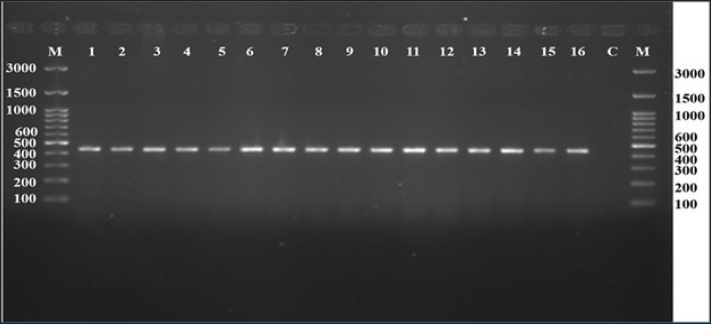 Fig. 2. Agarose gel electrophoresis of mitochondrial 16S rRNA polymerase chain reaction products from Hyalomma ticks. A 450-bp fragment was amplified in all samples (lanes 1–16). Lane C was used as a negative control with no amplification. Lane M contained a 100 bp molecular size marker (GeneDirex, South Korea). Amplification confirmed the DNA quality and molecular identification.