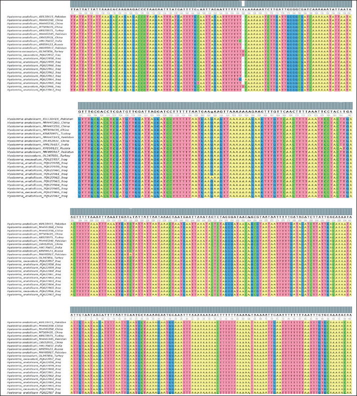 Fig. 4. Multiple sequence alignment of mitochondrial 16S rRNA partial sequences of H. anatolicum with global references. Local isolates PQ623957–PQ623967 showed 99.48%–100% sequence identity with sequences from China and Pakistan, confirming close similarity. H. excavatum reference sequences displayed clear differences that separated them from H. anatolicum.