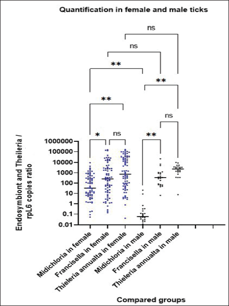 Fig. 5. FLE, Ca. M. mitochondrii and T. annulata densities in female and male H. anatolicum ticks. Note that the copy number ratio has been subjected to a log10 transformation. This shows a significant difference (p ˂ 0.05) between the three different microorganisms after normalization with the internal control L6 (rpl6) gene of Ixodes scapularis. ConclusionHyalomma anatolicum is the main cattle tick in Al-Diwaniyah province, accounting for 86% of all examined specimens. Molecular analysis confirmed almost complete genetic similarity to H. anatolicum populations from other regions. FLEs and Ca. M. mitochondrii were highly prevalent, and females had higher symbiont densities than males. T. annulata was found in all samples, with the highest loads in semi-engorged females. Statistical analysis revealed a positive correlation between Ca. M. mitochondrii and T. annulata, indicating a possible biological association that may support pathogen persistence. The findings show the central role of H. anatolicum in transmitting tropical theileriosis and point to microbiome-based approaches as future strategies for controlling the disease. AcknowledgmentsWe sincerely thank the College of Veterinary Medicine, University of Al-Qadisiyah, for their support and for providing the facilities necessary to conduct this study. Conflict of interestThe authors declare no conflict of interest. FundingNo specific funding source is available for this study; however, the work was self-funded. Authors' contributionsAlaa designed the study, and Azhar performed and analyzed the result; both contributed to the manuscript writing Data availabilityThe corresponding author can provide complete data when requested. ReferencesAdegoke, A., Kumar, D., Bobo, C., Rashid, M.I., Durrani, A.Z., Sajid, M.S. and Karim, S. 2020. Tick-borne pathogens shape the native microbiome within tick vectors. Microorganisms 8, 1299. Afshari, A., Tavassoli, M., Esmaeilnejad, B., Habibi, G. and Esmaeilnia, K. 2021. Molecular characterization and phylogenetic analysis of pathogenic Theileria spp. isolated from cattle and sheep based on cytochrome b gene in Iran. Arch. Razi Inst. 76, 243. Al-Abedi, G.J.K. and Al-Amery, A.M.A. 2021. Molecular diagnosis and phylogenetic analysis of Babesia species isolated from ticks of infested cattle in Wasit Governorate, Iraq. Iraqi J. Agri. Sci. 52(1), 136–145. Albayati, H.H., Al Khafaji, A.M., Kamel, A. and Al-Karagoly, H. 2023. Microscopical and phylogenetic analysis of Theileria annulata in Iraqi local breed cattle. Vet. Integr. Sci. 21, 457–472. Al-Fatlawi, M., Ali, M. and Albayati, H. 2018. Morphological and phylogenetic study of Hyalomma anatolicum in Al-Najaf, Iraq. Iraqi. J. Vet. Sci. 32, 261–266. Al-Zubaidei, H.H., Hasson, R.H., Al-Ani, M.O., Fayyad, E.J., Abbas, S.F. and Al-Khfaji, T.H. 2023. Geographical distribution of Ixodidae (hard ticks) in all provinces Iraq. Iraqi J. Vet. Sci. 37(Supplement IV), 197–201. AL-Mayah, S.H. and Abdul-Karim, A.T. 2020. Epidemiology and seasonal variation of ixodid ticks and Piroplasmida detection in cattle of Basrah province, Iraq. Indian J. Forensic Med. Toxicol. 14(3), 1391–1398. Ali, M.J., Atiyah, W.R., Al-Fatlawi, M.A. and Khlaif, S.F. 2021. Genotypic analysis of ticks species infesting cattle in Al-Diwaniyah abattoir. Iraqi. J. Vet. Sci. 35, 673–677. Ali, Z., Maqbool, A., Muhammad, K., Khan, M.S. and Younis, M. 2013. Prevalence of Theileria annulata infected hard ticks of cattle and buffalo in Punjab, Pakistan. J. Anim. Plant Sci. 23, 20–26. Al-Khafaji, A. 2018. Interactions between pathogenic and non-pathogenic Rickettsiales and the tick host. Liverpool, UK: The University of Liverpool. Al-Shabbani, A.H. and Al-Fatlawi, M.A. 2023. Morphological and genotypical identification of Hyalomma anatolicum isolated from cattle in Al-Daghara city, Al-Qadisiyah province, Iraq. Iraqi. J. Vet. Sci. 37, 683–687. Al-Wasmee, A.K.K., Hassone, W.S., Al-Janabi, H.T. and Al-Jabory, H.A. 2024. Molecular prevalence of theileriosis in calf at Babylon, Iraq. Adv. Anim. Vet. Sci. 12, 1061–1065. Ammazzalorso, A.D., Zolnik, C.P., Daniels, T.J. and Kolokotronis, S.O. 2015. To beat or not to beat a tick: comparison of DNA extraction methods for ticks (Ixodes scapularis). PeerJ 3, e1147. Azagi, T., Klement, E., Perlman, G., Lustig, Y., Mumcuoglu, K.Y., Apanaskevich, D.A. and Gottlieb, Y. 2017. Francisella-like endosymbionts and Rickettsia species in local and imported Hyalomma ticks. Appl. Environ. Microbiol. 83, e01302–e01-17. Aziz, K. 2022. Morphological and molecular identification of Ixodid ticks that infest ruminants in Erbil province, Kurdistan Region-Iraq. Passer. J. Basic. Appl. Sci. 4, 8–13. Benyedem, H., Lekired, A., Mhadhbi, M., Dhibi, M., Romdhane, R., Chaari, S., Rekik, M., Ouzari, H.I., Hajji, T. and Darghouth, M.A. 2022. First insights into the microbiome of Tunisian Hyalomma ticks gained through next-generation sequencing with a special focus on H. scupense. PLos One. 17, 268172. Biglari, P., Bakhshi, H., Chinikar, S., Belqeiszadeh, H., Ghaffari, M., Javaherizadeh, S., Faghihi, F. and Telmadarraiy, Z. 2018. Hyalomma anatolicum as the main infesting tick in an important livestock rearing region, central area of Iran. Iran. J. Public Health 47, 742. Bonnet, S.I. and Pollet, T. 2021. Update on the intricate tango between tick microbiomes and tick‐borne pathogens. Parasite. Immunol. 43, e12813. Boyer, P.H., Almeras, L., Plantard, O., Grillon, A., Talagrand-Reboul, E., Mccoy, K., Jaulhac, B. and Boulanger, N. 2019. Identification of closely related Ixodes species by protein profiling with MALDI-TOF mass spectrometry. PLos One 14, 223735. Buysse, M. and Duron, O. 2018. Multi-locus phylogenetics of the Midichloria endosymbionts reveals variable specificity of association with ticks. Parasitology 145, 1969–1978. Buysse, M., Floriano, A.M., Gottlieb, Y., Nardi, T., Comandatore, F., Olivieri, E., Giannetto, A., Palomar, A.M., Makepeace, B.L., Bazzocchi, C., Caf