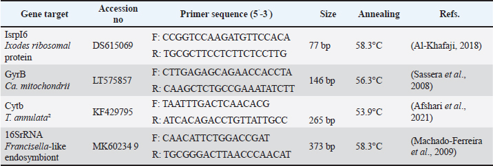 AbstractBackground: Ticks are significant vectors of pathogens, and their nonpathogenic intracellular bacteria, known as endosymbionts, influence tick physiology and may interact with tick-borne pathogens. Such relationships can affect transmission dynamics, and understanding them is essential for designing strategies that control tick-borne diseases and reduce their impact on human and animal health. Aim: This study aimed to determine the prevalence and density of two key endosymbiotic bacteria, Francisella-like endosymbiont (FLE) and Candidatus Midichloria mitochondrii (Ca. M. mitochondrii), and to investigate possible correlations between these symbionts and the protozoan parasite Theileria annulata in Hyalomma anatolicum ticks. Methods: Between January and October 2024, 116 ticks were collected from cattle in the Diwaniyah province, Iraq. The morphological examination was followed by molecular confirmation using mitochondrial 16S rRNA sequencing. Quantitative polymerase chain reaction was applied to detect and quantify FLE, Ca. M. mitochondrii, and T. annulata in H. anatolicum. Results: Hyalomma anatolicum was the predominant species, representing 86% of ticks, whereas H. excavatum accounted for 13%. Mitochondrial 16S rRNA sequences confirmed species identity and showed 99.48%–100% similarity to reference isolates from China, Pakistan, Turkey, India, and Russia. FLE was detected in 100% of H. anatolicum, with mean loads of 7.9 × 103 copies per tick. Ca. M. mitochondrii was detected in 99% of specimens, with mean loads of 3.7×102 copies per tick. FLE densities tended to be higher in females compared to males (9.7 × 10³ copies vs. 1.8 × 10³ copies), but the difference was not statistically significant. Candidatus Midichloria mitochondrii loads also differed significantly (4.8 × 10² copies vs. 1.3 × 10¹ copies). Theileria annulata was present in all ticks, with the highest copy numbers in semi-engorged females (1.9 × 104 copies), followed by males (2.8 × 10³ copies). Our findings revealed a statistically significant association (p < 0.05) between T. annulata and Ca. M. mitochondrii, whereas no significant correlation was observed between T. annulata and FLE. Conclusion: The presence of FLE and Ca. M. mitochondrii in H. anatolicum from the Diwaniyah province was documented. Evidence indicated associations between symbiont density and T. annulata infection, and the results point toward a possible role of endosymbiotic bacteria in pathogen persistence and the epidemiology of tick-borne diseases. Keywords: 16S rRNA, Endosymbionts, Hyalomma, Francisella, Ticks. IntroductionTicks are obligate blood-feeding ectoparasites of animals and humans and rank just behind mosquitoes as vectors of pathogens with major implications for human and veterinary health (de la Fuente et al., 2008). Their long feeding periods and multi-host life cycles enable them to transmit diverse protozoan, bacterial, and viral pathogens. Infestations in livestock cause direct harm through blood loss, skin damage, and reduced productivity, whereas tick-borne pathogens reduce milk yield, impair growth, and increase mortality (Gomes et al., 2018). Global losses due to ticks are estimated at US$22–30 billion per year. In South Asia alone, the annual economic impact of ticks and tick-borne diseases is approximately US$800 million (Nandi et al.,2023). Among the ixodid ticks, Hyalomma anatolicum is recognized as one of the most significant species. Its wide distribution across the Middle East, North Africa, and South Asia, coupled with its adaptability to varied environments, explains its prominence in tick-borne disease transmission (Shyma et al., 2012; Biglari et al., 2018). The species transmits several pathogens of veterinary and zoonotic concern, including Theileria annulata, T. equi, T. lestoquardi, Anaplasma spp., Rickettsia spp., and Crimean-Congo hemorrhagic fever virus (Celina et al., 2025). Along with Rhipicephalus microplus, it is one of the most economically damaging tick species for cattle in endemic regions (Gomes et al., 2018). Climate change and land use shifts are expanding the range and seasonality of Hyalomma ticks, which increases the risk of pathogen transmission in previously unaffected areas (Nasiri et al., 2025). Theileria annulata-induced tropical theileriosis is a major constraint on cattle production in endemic areas. The parasite infects leukocytes and erythrocytes, resulting in fever, lymph node enlargement, anemia, and potentially fatal outcomes. Even when animals survive, production losses through reduced milk yield, poor growth, and infertility are severe (Gomes et al., 2018). An estimated 250 million cattle are at risk worldwide (Afshari et al., 2021). In Iraq, T. annulata remains endemic in the central and southern provinces, with a prevalence ranging from 40% to more than 80%, depending on the region and diagnostic method (Mohammad Al-Saeed et al., 2010; Al-Fatlawi et al., 2018; Kawan, 2019; Al-Wasmee et al., 2024). Neighboring countries report comparable rates, underscoring the transboundary threat (Ali et al., 2013; Köseoğlu et al., 2021; Omer et al., 2021). These burdens highlight the need for enhanced control strategies beyond traditional acaricides, especially as resistance to chemical treatments is increasingly reported (Shyma et al., 2012). Ticks harbor diverse microbial communities that influence their physiology and association with pathogens. Obligate symbionts such as Francisella-like endosymbiont (FLE) and facultative symbionts such as Candidatus Midichloria mitochondrii are frequently detected in Hyalomma ticks. These bacteria supplement essential nutrients absent from vertebrate blood, contribute to reproduction, and may affect survival (Sassera et al., 2008; Bonnet and Pollet, 2021). FLE prevalence has been reported to exceed 90% in Hyalomma populations (Ghafar et al., 2020; Perveen et al., 2020; Soliman et al., 2025). Candidatus Midichloria mitochondrii has str