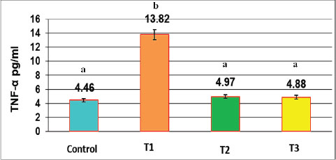 Fig. 1. Effect of oral administration of NAC and Augmentin on TNF-α Activity (mg/dl) in male rats LSD=0.880. Data are presented as mean ± SEM for each group (n=10). Statistical significance was determined using one-way ANOVA followed by Tukey’s post hoc test. Different letters above the bars indicate significant differences between groups (p < 0.05).