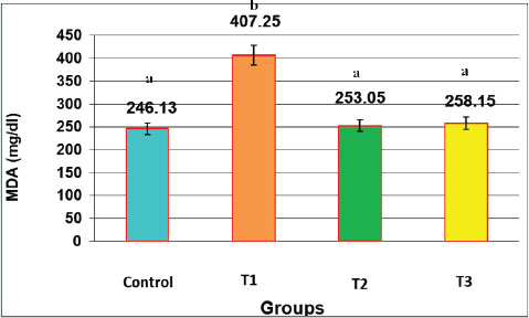 Fig. 2. Effect of oral administration of NAC and augmentin on MDA activity (mg/dl) in male rats LSD=2.320. Summed levels of MDA and TNF-α show the cumulative oxidative-inflammatory burden in each group. Data are presented as mean ± SEM for each group (n=10). Statistical significance was determined using one-way ANOVA followed by Tukey’s post hoc test. Different letters above the bars indicate significant differences between groups (p < 0.05).