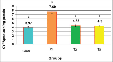 Fig. 4. Effect of oral administration of NAC and Augmentin on CYP7 expression (pmol/min/mg protein) in male rats LSD=1.057. Percent change in CYP7A1 activity relative to the control group. Significant increase in T1, whereas NAC normalized this effect. Data are presented as mean ± SEM for each group (n=10). Statistical significance was determined using one-way ANOVA followed by Tukey’s post hoc test. Different letters above the bars indicate significant differences between groups (p < 0.05).