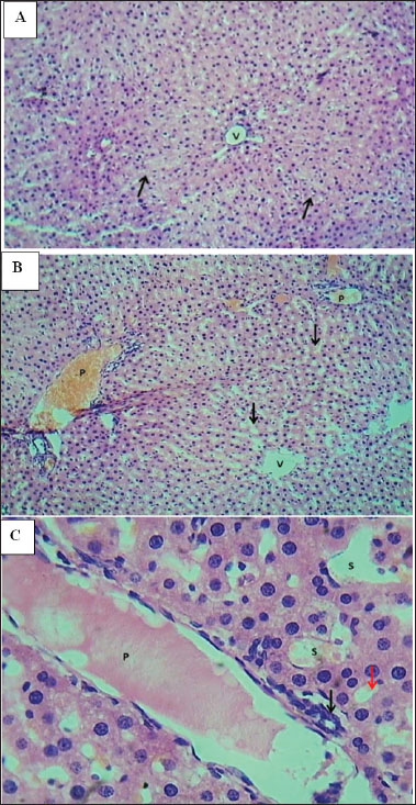 Fig. 5. Cross-section of the liver. A. Control group shows: hepatic lobules show normal central vein (V), with normal sinusoids and normal appearance of hepatic cords (arrows). H&E.100×. B. The T1 group shows severe congestion with portal vein dilation (P) with cholangiocyte proliferation. Severe dilation with sinusoid congestion (Arrows) (Arrows).H&E.100×. C. T1 group shows severe portal vein dilation with intravascular hemolysis (P) and cholangiocyte proliferation (Black arrow), severe sinusoid congestion (S) and bile canaliculi dilation (Red arrows).H&E.400×.