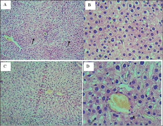 Fig. 6. Cross-section of hepatic lobules. A. The T2 group shows normal central vein (V), with normal sinusoids and normal hepatic cord appearance (arrows). H&E.100×. B. The T2 group shows: normal sinusoids (S) and normal appearance of hepatocytes (H) and bile canaliculus (c) .H&E.400×. C. The T3 group shows: mild venostasis of the central vein and normal hepatocytes. H&E.100×. D. The T3 group shows mild venostasis of the central vein with normal hepatocytes and normal sinusoid and canaliculi. H&E.400×.