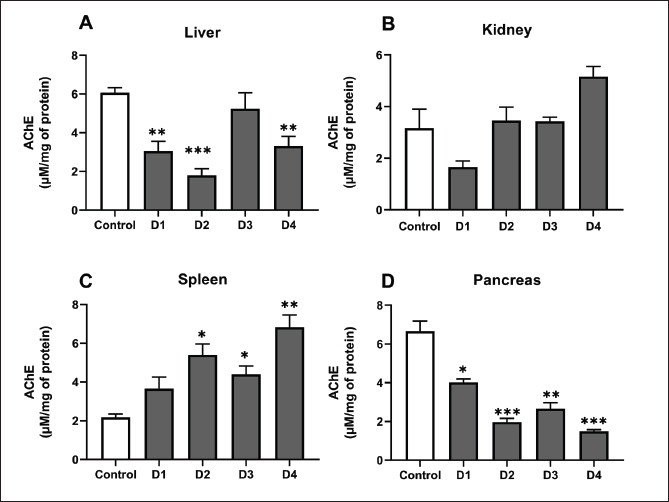 Fig. 5. MDA levels in the liver (A), kidney (B), spleen (C) and pancreas (D) of control rats and rats exposed to different ferrous sulfate doses (12.5 mg/kg [D1], 25 mg/kg [D2], 50 mg/kg [D3] and 100 mg/kg [D4]) for 06 weeks. Values are expressed as the mean ± SEM. n=6 rats per group. Comparisons between control and treated rats were conducted using Welch's ANOVA test followed by Games-Howell's multiple comparisons test. ** p < 0.01, *** p < 0.001 compared to the control rats. AChE activityAfter 6 weeks of treatment, AChE activity showed distinct variations across the studied organs, reflecting a dose-dependent influence of ferrous sulfate (Fig. 6). In the liver, AChE activity decreased significantly (−52%, p < 0.003) at the dose 12.5 mg/kg and significantly decreased (72%, p < 0.001) at 25 mg/kg. At 50 mg/kg (5.24 ± 0.97 µmol/min/mg, −18%), no significant difference (p= 0.80) was noted, whereas at 100 mg/kg (3.32 ± 0.70 µmol/min/mg, −48%), the decrease was again significant (p < 0.01) (Fig 6A). In the pancreas, a significant decline (p= 0.02) was recorded at 12.5 mg/kg (4.32 ± 0.48 µmol/min/mg, −35%), followed by a significant decrease (p < 0.001) at 25 mg/kg (1.98 ± 0.86 µmol/min/mg, −70%) and 50 mg/kg (2.66 ± 1.02 µmol/min/mg, −60%, p=0.001). The inhibition was more pronounced and highly significant (p < 0.001) at 100 mg/kg (1.50 ± 0.68 µmol/min/mg, −77%) compared with the control (6.66 ± 1.27 µmol/min/mg) (Fig. 6A). In the spleen, AChE activity increased significantly (p=0.01) at 25 mg/kg at 25 mg/kg (5.39 ± 1.41 µmol/min/mg, +147%) compared with the control (2.18 ± 0.89 µmol/min/mg). At 50 mg/kg (4.40 ± 1.06 µmol/min/mg, +102%), the increase remained significant (p=0.01), whereas at 100 mg/kg (6.83 ± 1.57 µmol/min/mg, +213%), the increase was highly significant (p=0.003), with no significant change at 12.5 mg/kg (p=0.25) compared with the control group (Fig. 6C).