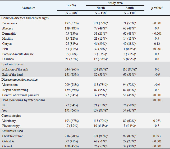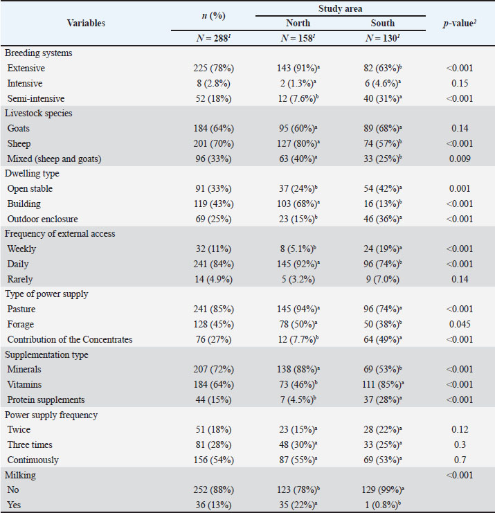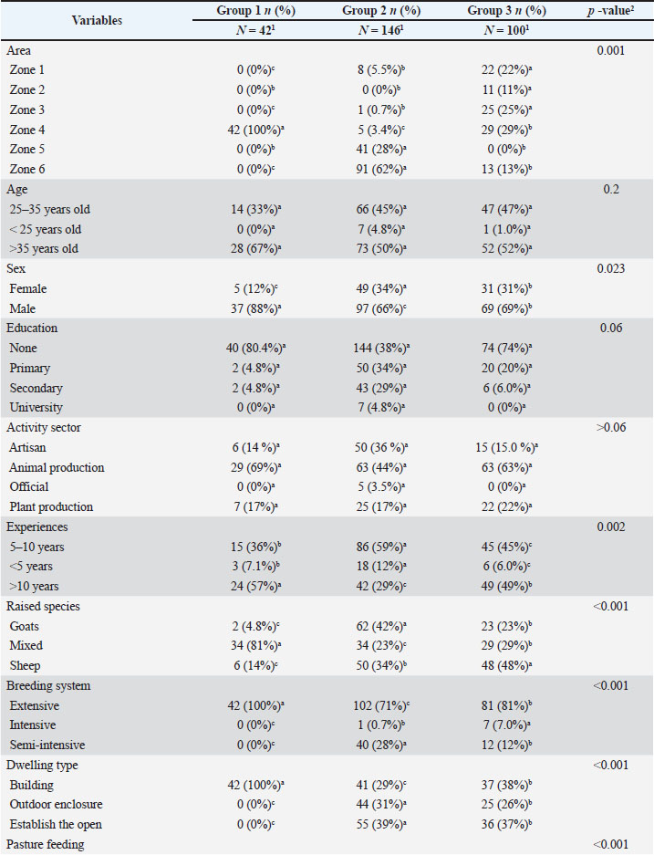 Fig. 1. Mapping of the study area. n=Z2 *P*(1−p)/e2. With an expected proportion (p) of farmers engaged in dairy production set at 50%, a margin of error (e) set at 5%, and a confidence interval (Z) of 90%. The minimum sample size was estimated at n=271 farmers. However, 288 people were surveyed. The data collection tool used was a specially designed semi-structured questionnaire divided into three sections: (1) socio-demographic characteristics of farmers, (2) animal management practices, and (3) production objectives. The form was then digitized on KoboToolbox and administered to the farmers via smartphones by interviewers trained in the use of the questionnaire beforehand. The farms were located based on consultation with veterinary service officers in each commune, while enrollment for the study was based on random sampling, and each respondent was interviewed based on informed consent. Data analysisThe collected data were exported to a Microsoft Excel workbook and recorded before statistical analysis using R Software 4.0.5. First, a descriptive analysis was conducted to calculate the proportions of the modalities of the different variables of interest. Next, 17 qualitative variables describing the sociodemographic characteristics and breeding practices of the farmers were identified and then subjected to a multiple correspondence analysis (MCA) followed by an ascending hierarchical classification (ACH) using the FactoMineR package. Finally, we used parametric and non-parametric tests, such as the chi-square test, Wilcoxon test, Fisher’s exact test, or Kruskal–Wallis test, as appropriate to assess differences between the categorical variables of interest. For all comparisons, the p-values were set at a threshold of p < 0.05 ResultsDescription of the farming practicesSociodemographic characteristics of the respondentsThe sociodemographic characteristics of the farmers are summarized in Table 1. A total of 288 small ruminant keepers from the southern (45.13%) and northern (54.8%) regions were included in this study. Approximately 70% of those interviewed were men, compared with 30% of women. More than half of them (55%) had not received any school education, and farmers in the southern region (68%) were much better educated than those in the northern region (26%). Furthermore, 54% of respondents had livestock production as their main activity, while most farmers (91%) were fairly experienced and had raised small ruminants for at least 5 years. Table 1. Sociodemographic characteristics of the surveyed farmers.