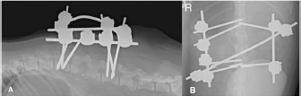 Fig. 3. Lateral (A) and dorso-ventral (B) postoperative radiograph of the lumbar spine showing the bilateral and biplanar external spinal skeletal fixator after curettage and manual reduction of the L2–L3 subluxation. Bacterial cultures were negative and the fungal organism was classified as Aspergillus terreus. No susceptibility test was performed. Antibiotic therapy was withdrawn, fluconazole was discontinued and voriconazol (Vfend; PfizerLtd, Kent, United Kingdom) was started at an extrapolated dose from human medicine of 3 mg/kg q12h PO. Radiographic follow-up by the referring veterinary surgeon two months later revealed lack of vertebral fusion and progressive osteolysis with new lesions at L1–L2, L3–L4, and L4–L5 intervertebral disc spaces (Fig. 5). Regardless, the vertebral column remained realigned without failure of the construct. The dog died approximately 3 months after the surgery following multi-organ failure. No loosening of the pins was noticed and post-mortem examination was not granted. DiscussionFungal discospondylitis is usually characterized by multiple distant lesions, indicating a systemic infection and reinforcing a hematogenous spread. Aspergillus terreus and Aspergillus fumigatus are commonly involved (Schultz et al., 2008). Surgical treatment of discospondylitis is reserved for medical failure, moderate and severe neurological deficits, considerable vertebral bony destruction, and vertebral instability (Gage, 1975; Gilmore, 1987; Ozuna and Delamarter, 1996). The aims are curettage, obtain biological samples, decompress the spinal cord, and stabilize to achieve bony fusion. Internal and external fixation devices have been used for the treatment of vertebral osteomyelitis in human literature (Jeanneret and Magerl, 1994; Dai et al., 2008). In dogs, polymethylmethacrylate and screws have been used in the treatment of thoracic (Cabassu and Moissonnier, 2007) and lumbosacral (Renwick et al., 2010; Font et al., 2013) bacterial discospondylitis, but not in the lumbar spine. Applying cement and/or screws to an infected area may pose a risk, but antibiotic-loaded cement can be successfully used (Cabassu and Moissonnier, 2007; Renwick et al., 2010; Font et al., 2013). A distraction-fusion technique using transarticular threaded pins across L7-S1, and bone graft, also reported satisfactory results in four canine cases (McKee et al., 1990; Font et al., 2013).