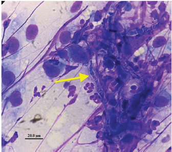 Fig. 4. Intraoperative cytology with Diff-Quick staining made of material collected during curettage at L2–L3 and showing fungal hyphae (arrow), non-degenerated neutrophils, and cells with a fusiform aspect and a prominent nucleus consistent with fibroblasts.