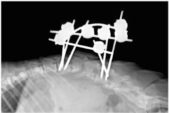 Fig. 5. Lateral radiograph of the thoracic and lumbar spine illustrating lack of vertebral fusion and increased osteolytic lesions at L2–L3 two months after surgery. New osteolytic lesions were observed at the endplates of the adjacent vertebra to L1–L2, L3–L4, and L4–L5 intervertebral disc spaces. The use of an ESSF has been previously used for the treatment of vertebral fractures (Lanz et al., 2000) and lumbosacral instability caused by bacterial discospondylitis (Auger et al., 2000). Its use was assessed in a canine unstable spinal model with spinal disarticulation between L3–L4. Mechanical properties comparable to more commonly used polymethylmethacrylate/ pin internal fixations techniques were identified. The study supports the biomechanical stability ESSF of the canine lumbar spine (Walker et al., 2002). The authors opted for ESSF due to the presence of extensive osteomyelitis, spinal cord compression, and subluxation. To prevent infection, the positive-partially-threaded pins were inserted in the vertebral bodies of L1 and L4, avoiding the infected sites. Had fusion been achieved after infection resolution, implant removal would have been easier compared to internal fixation. Intraoperative diagnosis using the smear technique cytology has been previously reported (Vernau et al., 2001; Font et al., 2014). A prompt presumptive diagnosis allowed the initiation of antifungal treatment while waiting for biopsy and culture results. The technique may provide information during the procedure allowing the neurosurgeon to take informed decisions. A variety of antifungal agents have been used for the treatment of disseminated aspergillosis in dogs (Schultz et al., 2008). Fluconazol was chosen initially because of its availability and broad spectrum. Because it appears less effective against filamentous fungi such as Aspergillus spp., it was changed for voriconazole following culture results (Greene, 2012), as it combines satisfactory systemic antifungal effects, high oral bioavailability and good bone penetration in humans (Koehler et al., 2014). Fungal osteomyelitis in dogs has been reported in axial and appendicular skeleton (Smith et al., 2000), but there is no previous report affecting the petrous bone and causing facial paralysis and head tilt. Other cranial nerves abnormalities have been previously described in dogs with systemic mycosis (Watt et al., 1995; Schultz et al., 2008). No sample was taken from the petrous bone, but the multiple distant osteomyelitic lesions suggested a disseminated fungal infection. Despite voriconazole treatment, our dog deteriorated progressively and never regained ambulation. The temporomandibular joint fracture caused pain; the vertebral osteolytic lesions increased, and episodes of diarrhea and hyporexia became frequent. The dog died 3 months after diagnosis. The 2 months’ follow-up imaging findings suggested the vertebral column remained aligned without failure of the construct, as so was at the time of death. The stability of ESSF in the lumbar region has been proven elsewhere (Walker et al., 2002). The use of an ESSF might provide stabilization of the vertebral column in cases of fungal or bacterial discospondylitis and should be considered an option when choosing the surgical technique. Conflict of interestThe authors declare that there is no conflict of interest. Author contributionsJ.B.: concept/design, acquisition of data, drafting of the manuscript, assembled figures, critical revision of the manuscript, and approval of the article. F.R.: acquisition of data, critical revision of the manuscript, and approval of the article. A.L: concept/design, acquisition of data, drafting of the manuscript, assembled figures, critical revision of the manuscript, and approval of the article. ReferencesAuger, J., Dupuis, J., Quesnel, A. and Beauregard, G. 2007. Surgical treatment of lumbosacral instability caused by discospondylitis in four dogs. Vet. Surg. 29(1), 70–80. Cabassu, J. and Moissonnier, P. 2007. Surgical treatment of a vertebral fracture associated with a haematogenous osteomyelitis in a dog. Vet. Comp. Orthop. Traumatol. 20(3), 227–230. Dai, L.Y., Chen, W.H. and Jiang, L.S. 2008. Anterior instrumentation for the treatment of pyogenic vertebral osteomyelitis of thoracic and lumbar spine. Eur. Spine J. 17, 1027–1034. Font, C., Mascort, J. and Lujan, A. 2013. Surgical internal stabilization in three canine cases with incomplete response to conservative management. In Proceedings of the Southern European Veterinary Conference, October, Barcelona, Spain. Font, C., Mascort, J., Márquez, M., Esteban, C., Sánchez, D., Durall, N., Pumarola, M. and Luján, A. 2014. Paraparesis as initial manifestation of a Prototheca zopfii infection in a dog. J. Small Anim. Pract. 55(5), 283–286. Gage, E.D. 1975. Treatment of discospondylitis in the dog. J. Am. Vet. Med. Assoc. 166, 1164–1169. Gilmore, D.R. 1987. Lumbosacral diskospondylitis in 21 dogs. J. Am. Anim. Hosp. Assoc. 23(1), 57–61. Greene, G.E. 2012. Antifungal chemotherapy. In Infectious diseases of the dog and the cat, 4th ed. Greene, G.E., St. Louis: Elsevier Saunders, pp: 579–588. Hurov, L., Troy, G. and Turnwald, G. 1978. Diskospondylitis in the dog: 27 cases. J. Am. Vet. Med. Assoc. 173(1), 275–281. Jeanneret, B. and Magerl, F. 1994. Treatment of osteomyelitis of the spine using percutaneous suction/irrigation and percutaneous external spinal fixation. J. Spinal Disord. 7(3), 185–205. Koehler, P., Tacke, D. and Cornely, O.A. 2014. Aspergillosis of bones and joints—a review from 2002 until today. Mycoses 57(6), 323–335. Lanz, O.I., Jones, J.C. and Bergman, R. 2000. Use of an external fixator to correct spinal fracture/luxation and instability in three dogs. Vet. Neurol. Neurosurg. 2(1). McKee, W.M., Mitten, R.W. and Labuc, R.H. 1990. Surgical treatment of lumbosacral discospondylitis by a distraction-fusion technique. J. Small Anim. Pract. 31(1), 15–20. Ozuna, R.M. and D