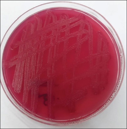 Fig. 3. Morphological characteristics of R. planticola: large, mucoid, gray, with gamma-hemolytic characteristics on blood agar. Large, mucoid, gray colonies with gamma-hemolytic characteristics were observed on the blood agar (Fig. 3). Under a light microscope (Fig. 4), R. Planticola are short, straight, gram–negative rods arranged singly or in pairs, as described by Morse et al. (2013). The isolates were positive for catalase, negative for oxidase, negative for indole, and positive for urease (Macfaddin, 2000). The purity of the R. planticola isolate was confirmed by the VITEK 2+ system, which consists of 64 biochemical tests (Table 1). The Vitek2 system was used to confirm the identification of the R. planticola isolate (Espinar et al., 2011).