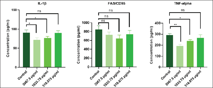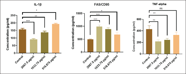 Fig. 8. The levels of cytokines (IL-1β, FAS, and TNF-α) in the supernatant of AMN3 cell lines at different concentrations of extracted pigment (2,067.5, 1,033.75, and 516.875 μg/ml) were determined.