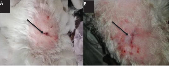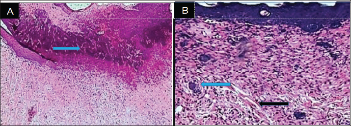 Fig. 2. Represents the macroscopic features of wounds between groups at day 35th post-operation. (A) control (B) treatment groups, showed the granulation, scar formation and healing were more rapid in rats of the treatment group, the area of wound was lower in rats of the treatment group (black arrow). Histopathological evaluationThe histopathological assessment revealed fundamental between the groups which became distinctly evident by day 7 post-wounding on day 3 demonstrated, epithelialization on the inner wall of the wound margins in the between groups, well-marked in treated with SIS-ECM powder. As well as, in control group showed no epithelialization was showed and inflammatory cells infiltration (Khan et al., 2014). On day 7 Advanced epithelialization was observed on the inner wound margins in the SIS-ECM powder-treated group, with the epithelium beginning to cover the entire exposed wound edge (Fig. 3A). In contrast, the control group exhibited incomplete epithelization, with a persistent and notable infiltration of inflammatory cells (Fig. 3B).