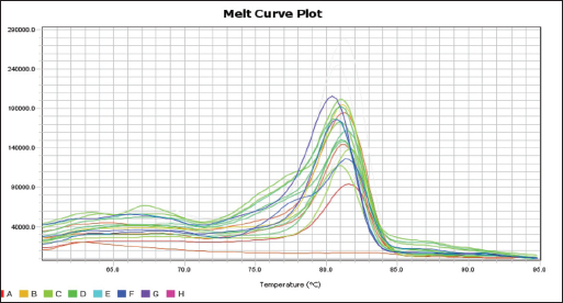 Fig. 4. Melt curve plot of the 16S rRNA gene of mycoplasma haemofelis positive samples. Table 1. Diagnostic agreement analysis between cytological examination and qPCR for the detection of equine Hemomycoplasmosis